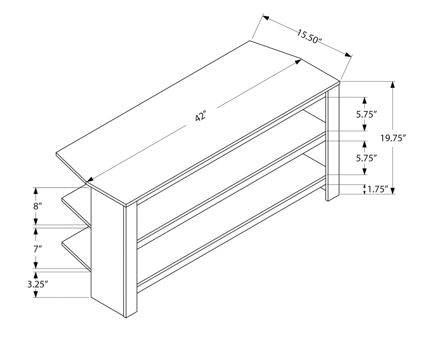 Largeur : 42 po (106,7 cm) Hauteur : 19,75 po (50,2 cm) Profondeur : 15,5 po (39,4 cm)