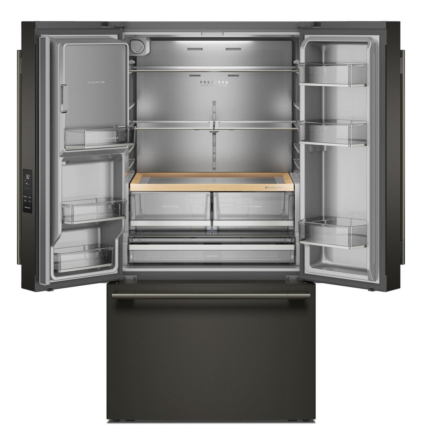 Généreuse capacité de 30 pi³ : Distributeur d’eau et de glaçons à l’extérieur : Plateau de rangement coulissant d’apparence bois : Production maximale de glaçons : Style personnalisable : Filtration d’eau everydropMD : |