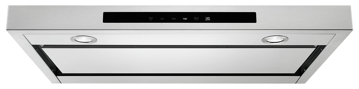 Conception à profil bas : Moteur à capacité de 400 pi3/min : Ventilation périmétrique : Système d'insonorisation Whisper QuietMD de 43 dB (0,1 sone) à basse vitesse : Réglage automatique de vitesse : Mise en marche automatique : Commandes électroniques tactiles en verre à 4 vitesses avec fonction d'amplification : Deux lumières de travail à DEL avec réglage veilleuse : Filtres à graisses lavables au lave-vaisselle : |