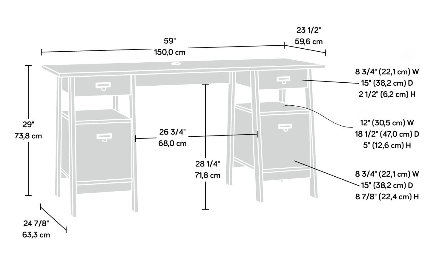 | Options de rangement | Deux tiroirs classeur pour les dossiers de format lettre, deux petits tiroirs et de l'espace entre les deux pouvant être utilisé comme tablette de rangement. |