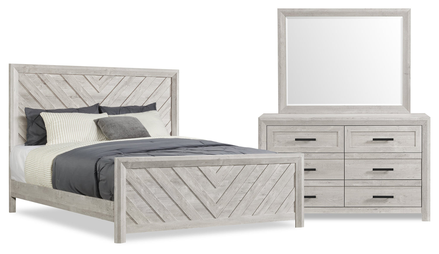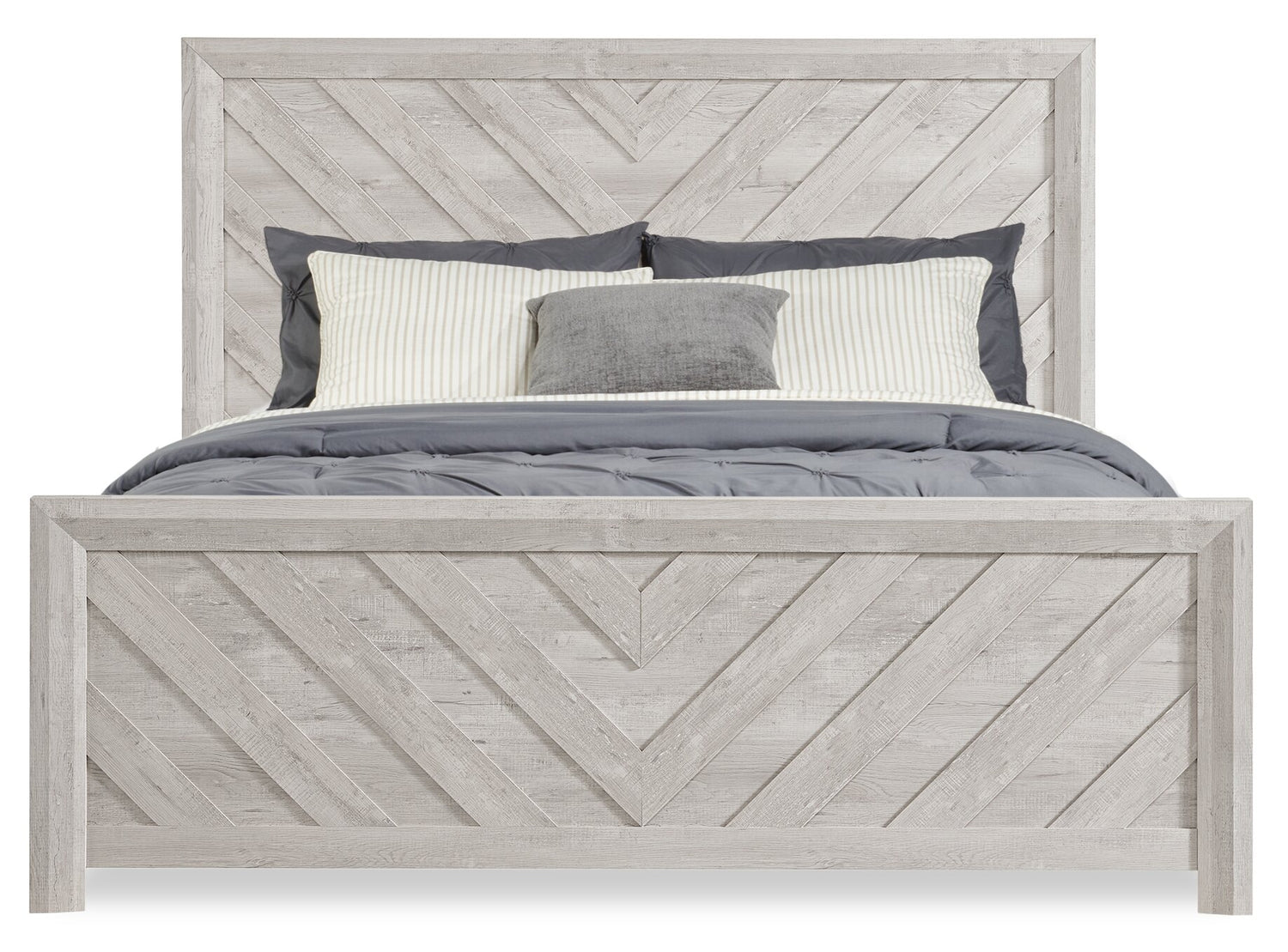 Lit à panneaux Lark blanc rustique avec tête de lit, cadre et motif de chevrons - format très grand lit