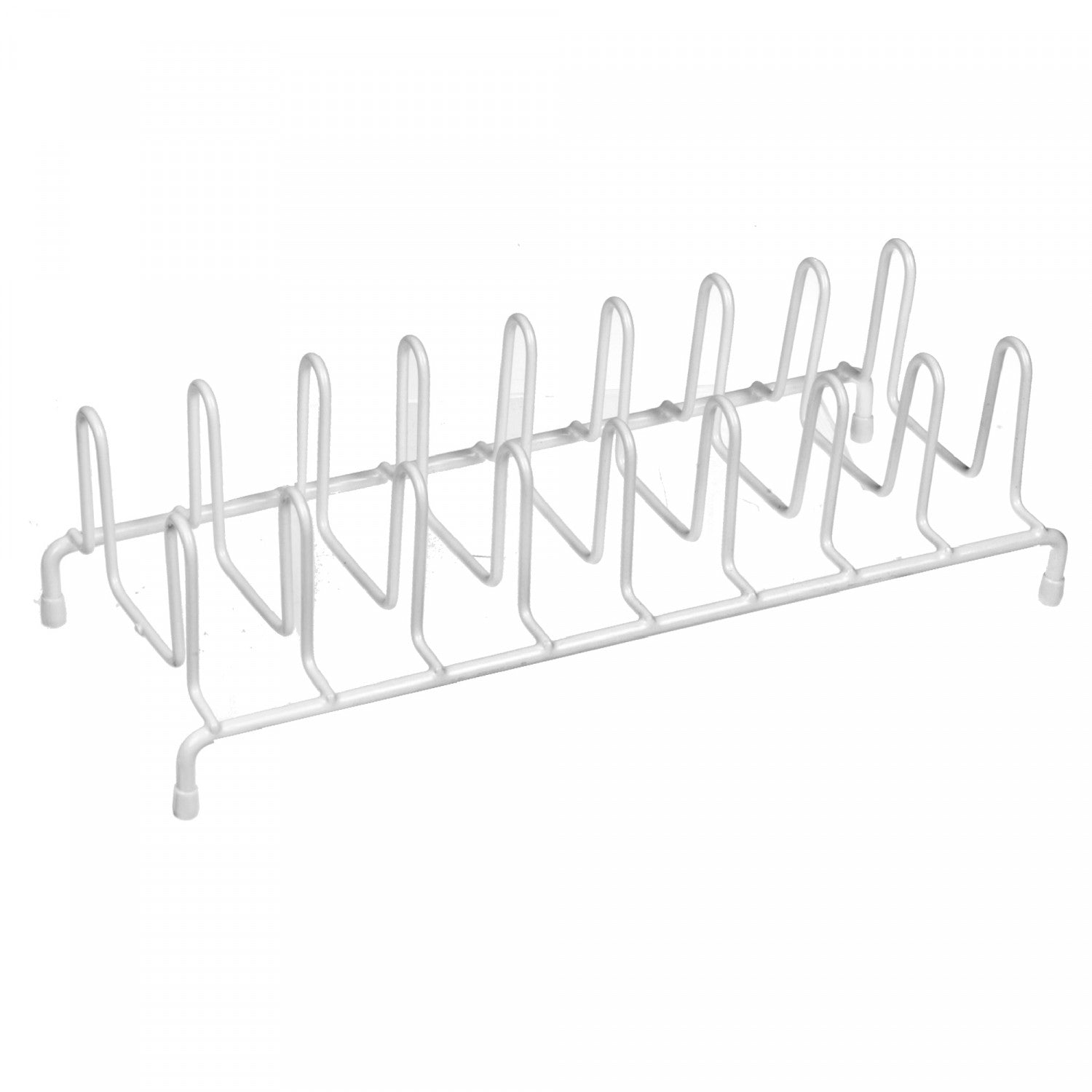 Intégrez ce range-assiette dans votre cuisine pour organiser les assiettes et les rendre plus accessibles. Vous pouvez conserver 8 assiettes dans les supports. Ce range-assiette possède une conception compacte qui occupe moins d'espace sur les comptoirs de votre cuisine. Il possède un revêtement blanc qui a belle allure dans n’importe quel décor de cuisine. Vous pouvez aisément la nettoyer avec un chiffon humide. Conception : Ce range-assiette possède une conception simple avec 8 supports d'assiettes. Utilisation : Utilisé pour organiser les assiettes de service. Dimensions : 5,5 po x 13,4 po x 3,75 po. Conseils d'entretien : Nettoyer avec un chiffon humide.