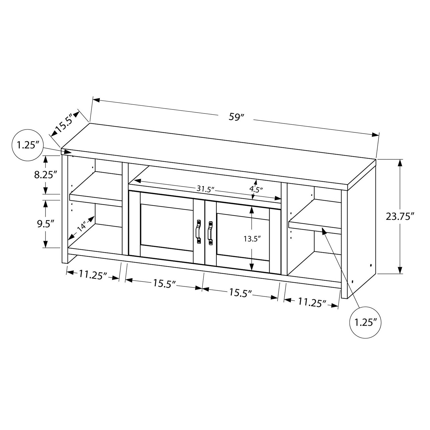 Largeur : 59 po (149,9 cm) Hauteur : 23,75 po (60,3 cm) Profondeur : 15,5 po (39,4 cm)