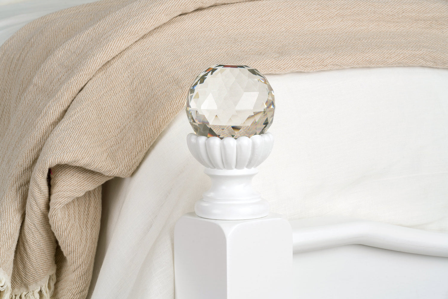 | Détails décoratifs | Un panneau en similicuir blanc est capitonné de boutons de cristal qui décorent la tête de lit. Des boules en cristal et des roses sculptées en bois ornent le dessus de la tête de lit et du pied de lit. |