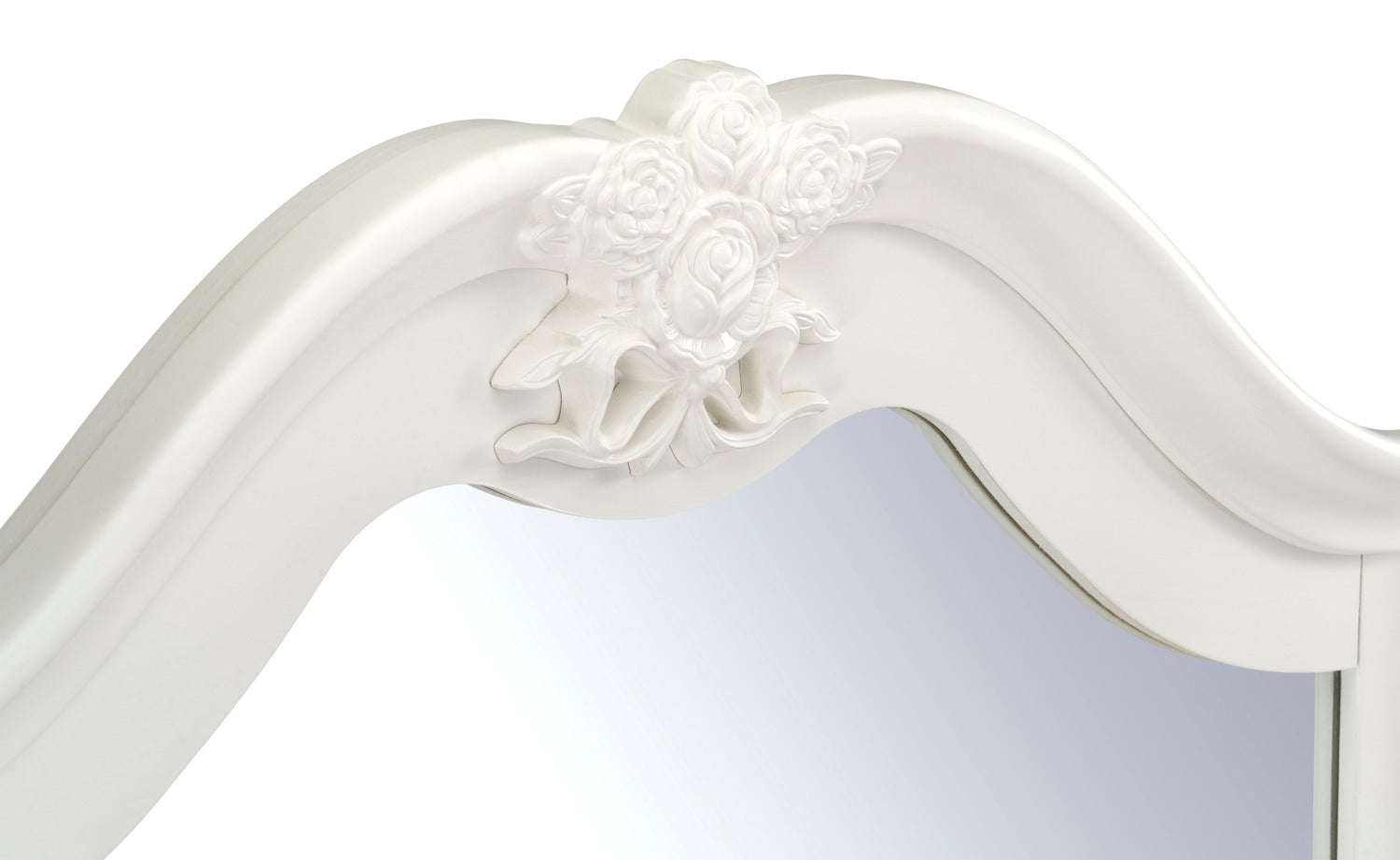 | Détails décoratifs | Un large cadre en bois affiche un dessus courbé orné d'un bouquet de roses sculptées en bois. |