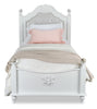 | Détails décoratifs | Un panneau en similicuir blanc est capitonné de boutons de cristal qui décorent la tête de lit. Des boules en cristal et des roses sculptées en bois ornent le dessus de la tête de lit et du pied de lit. |