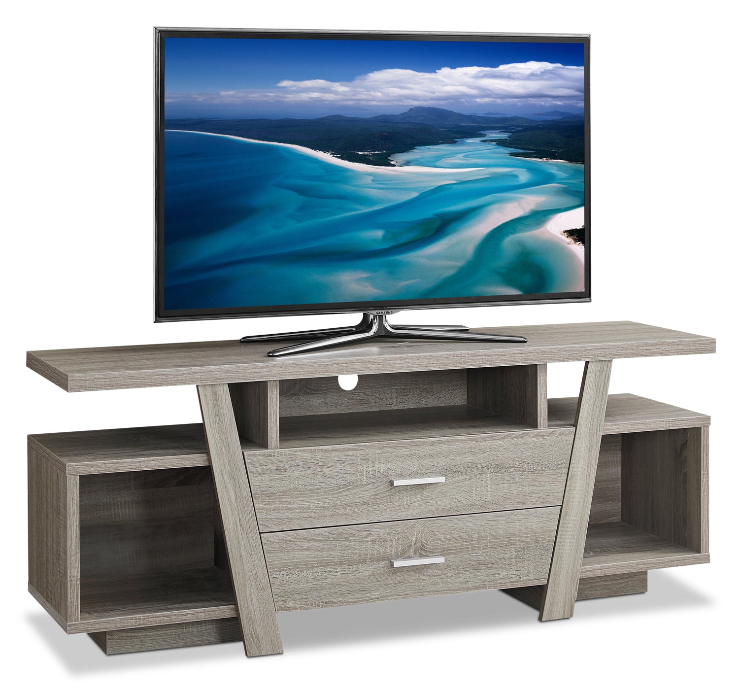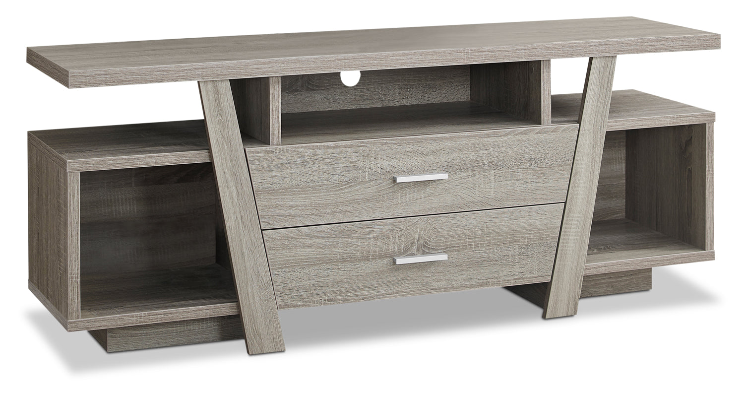 - Le style élégant, les détails en angle et le fini taupe foncé créent un meuble de divertissement raffiné.