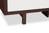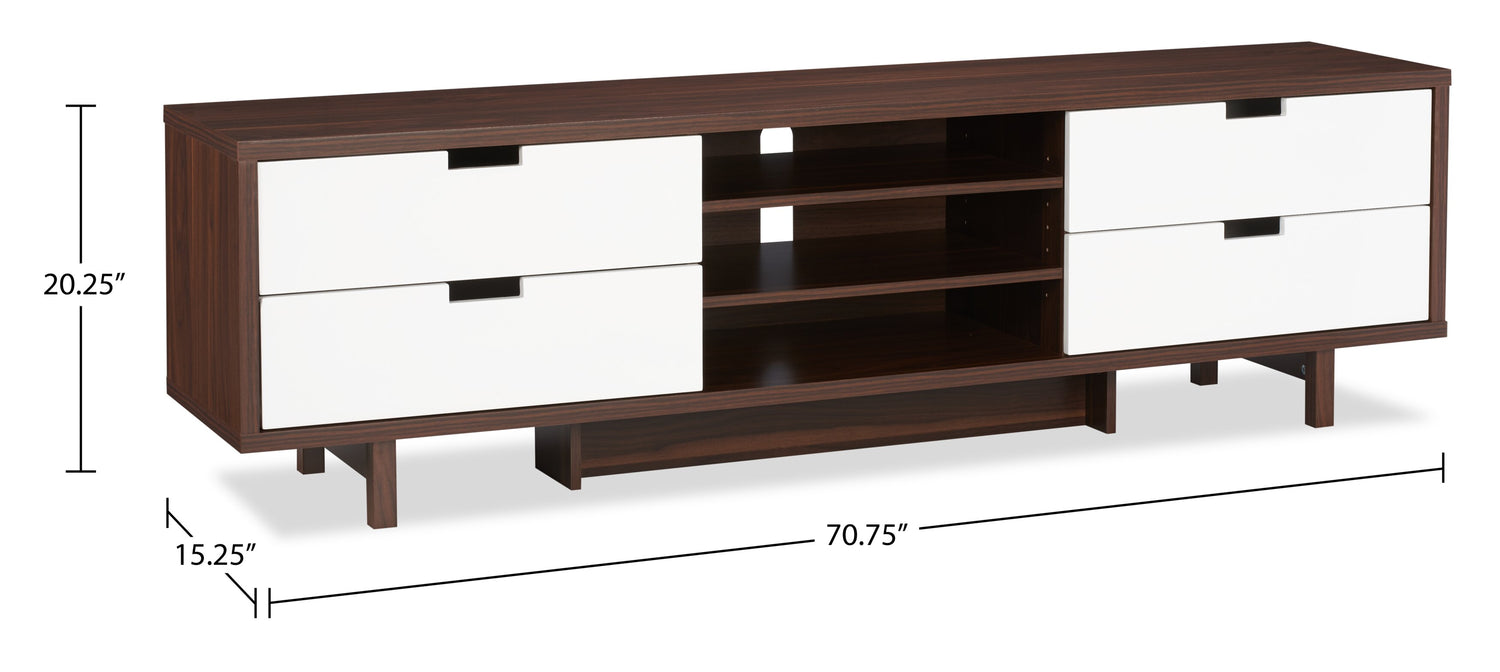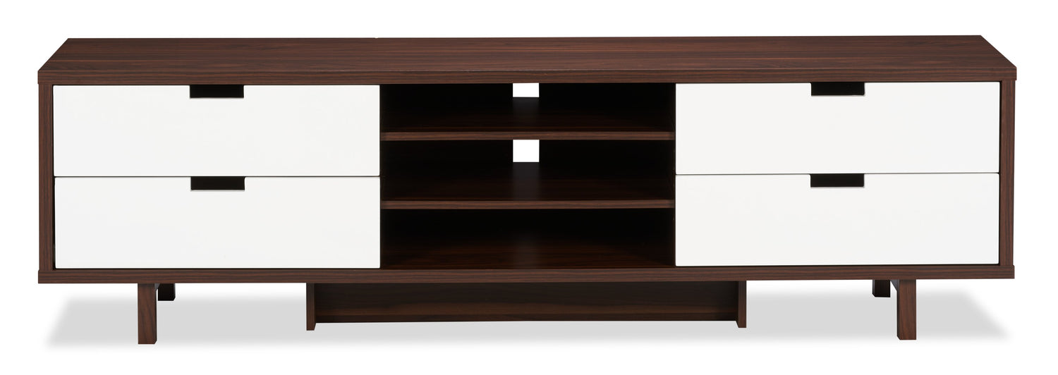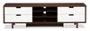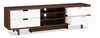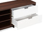 Le blanc lustré des tiroirs procure le contraste moderne parfait avec le noyer foncé de l'armature du meuble pour téléviseur.