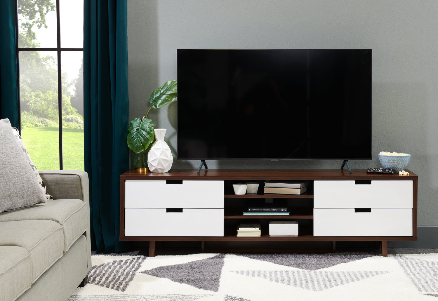 - Le meuble d'une longueur de 71 po peut aisément accueillir les téléviseurs à écran géant.