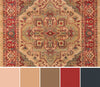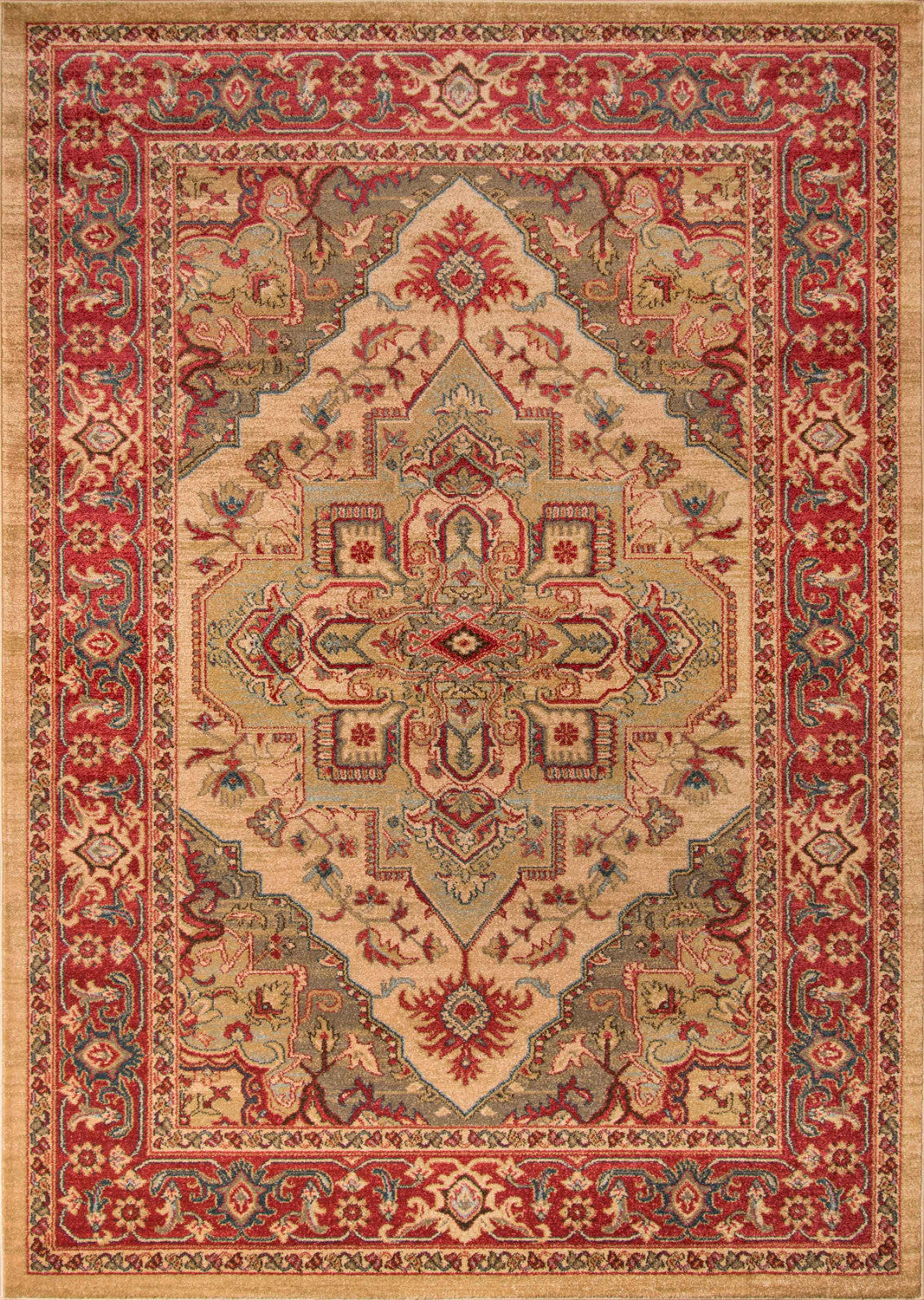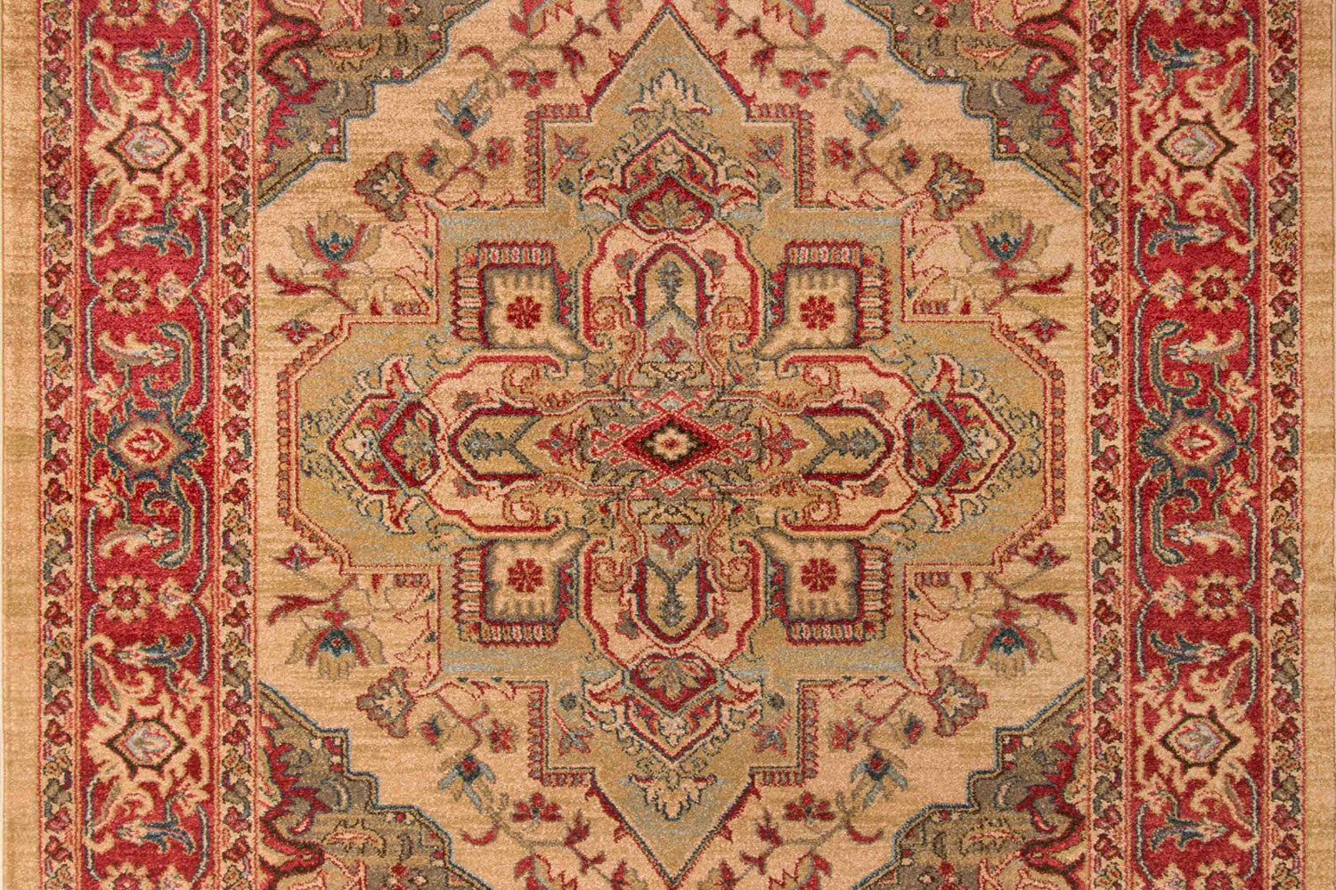 L’elegance ornementale de ce tapis traditionnel puise ses racines dans les motifs du vieux monde. Inspire des tapis Kazak classiques, son motif geometrique accrocheur compose de medaillons, palmettes et fleurs est encadre d’une bordure detaillee dans des teintes de rouge cramoisi, de bleu et d’or. Avec des references aux motifs ancestraux des tapis Heriz et Serapi, chaque design raffine est tisse avec precision a partir de fibres synthetiques douces, garantissant un tapis traditionnel concu pour resister a l’epreuve du temps.