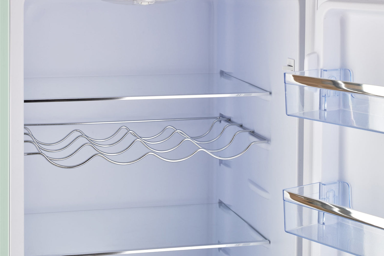 | Tablettes dans le réfrigérateur | Support à vin réglable pour 4 bouteilles, 4 tablettes en verre réglables et 3 tablettes de portes réglables pleine largeur |