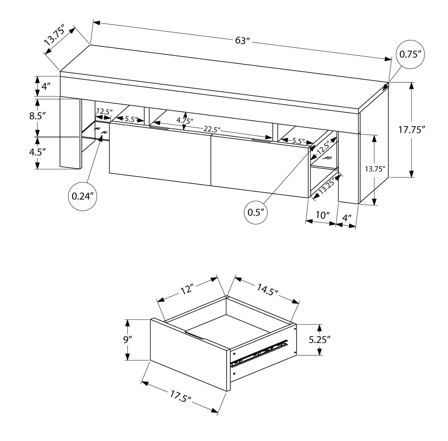 Largeur : 63 po (160,0 cm) Hauteur : 17,75 po (45,1 cm) Profondeur : 13,75 po (34,9 cm)