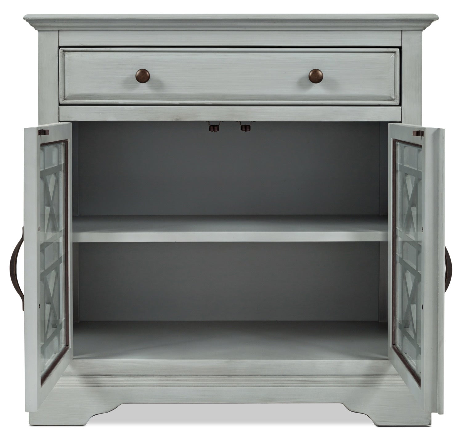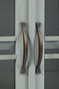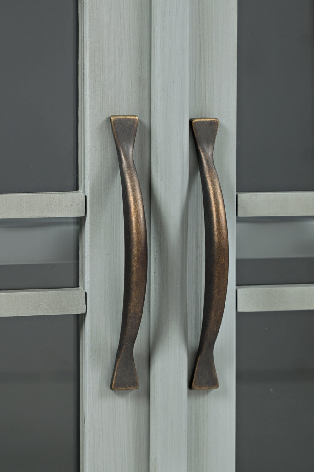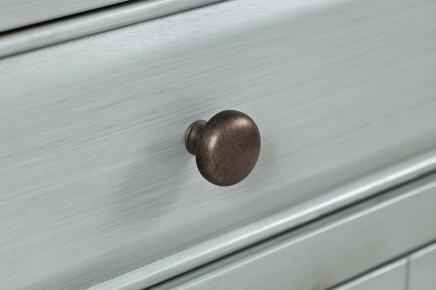 | Quincaillerie | Poignées et boutons en métal au fini laiton antique. |