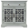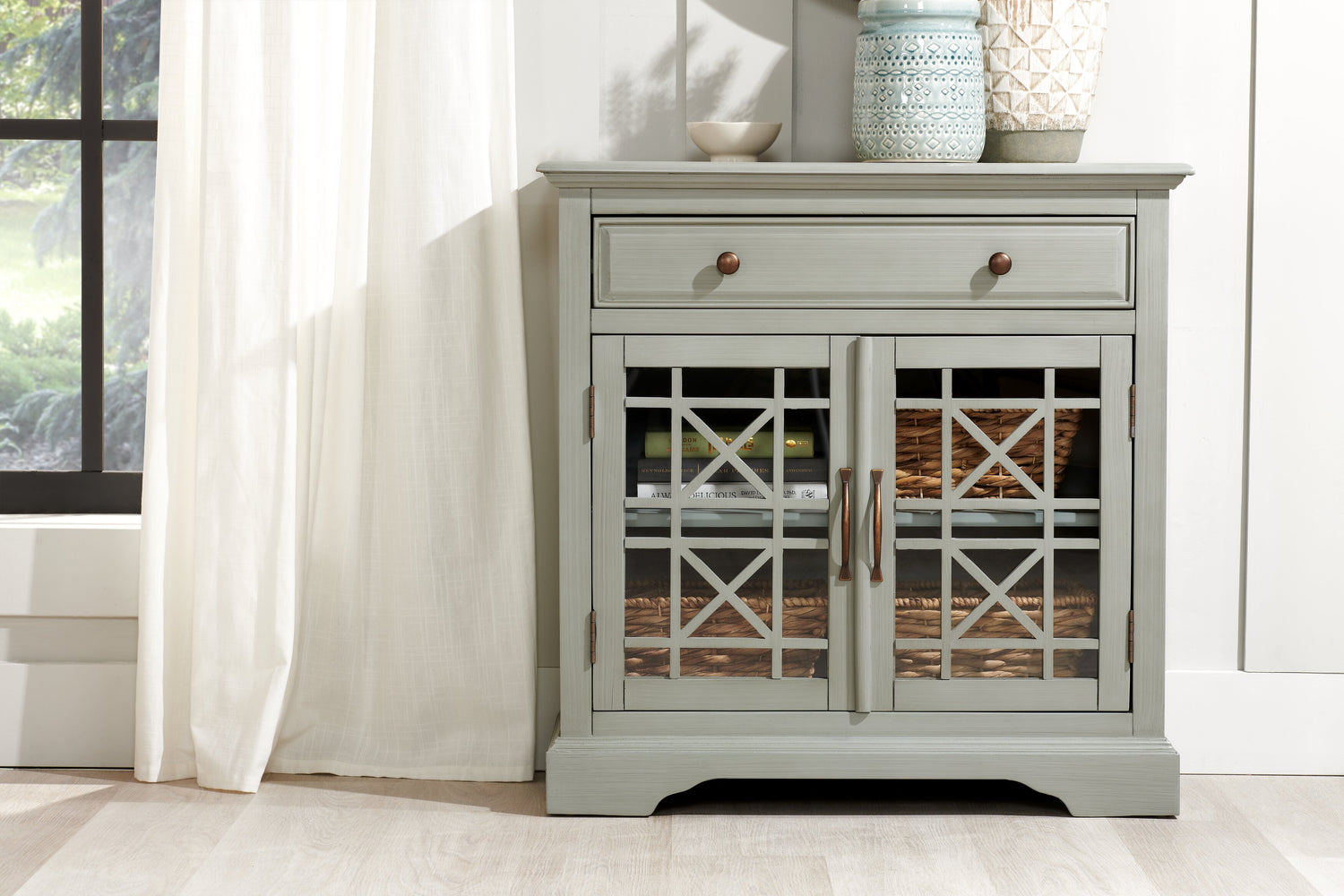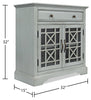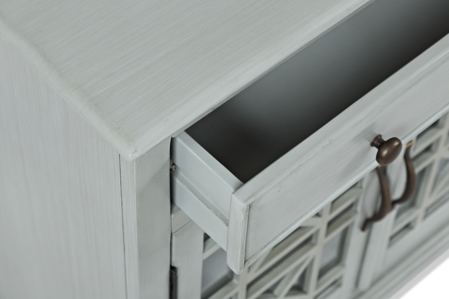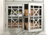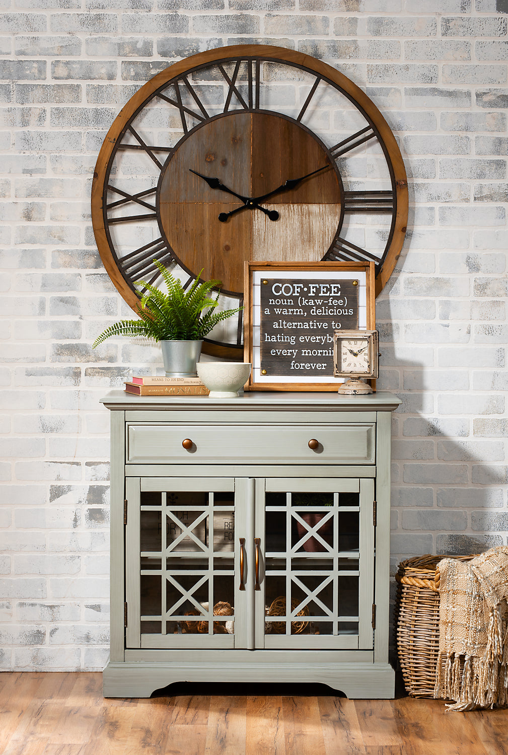 | Quincaillerie | Poignées et boutons en métal au fini laiton antique. |