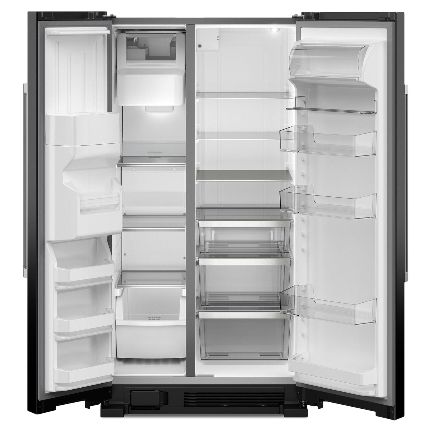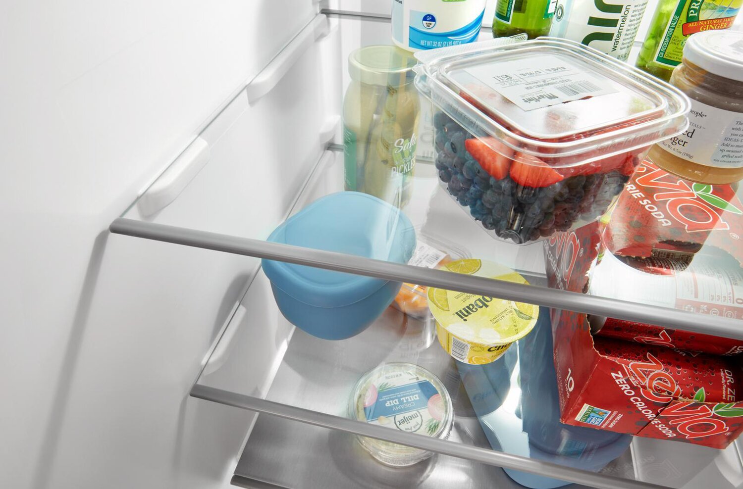 Bac pour contenants de grand format dans la porte : Distributeur d'eau et de glaçons à l'extérieur : Tablette en métal : Charnières de porte robustes : Machine à glaçons installée en usine : Support à cannettes : Bac à légumes FreshLockMC à humidité contrôlée : Tiroir à charcuteries et à collations : |