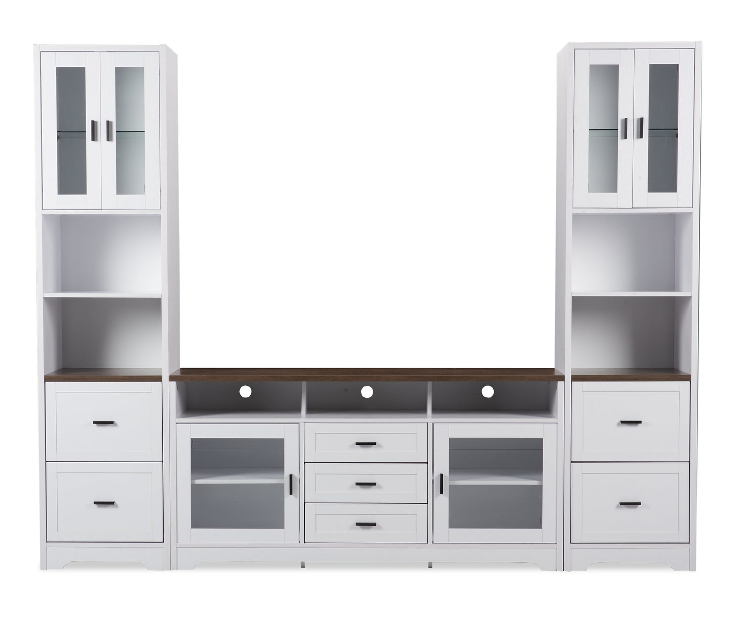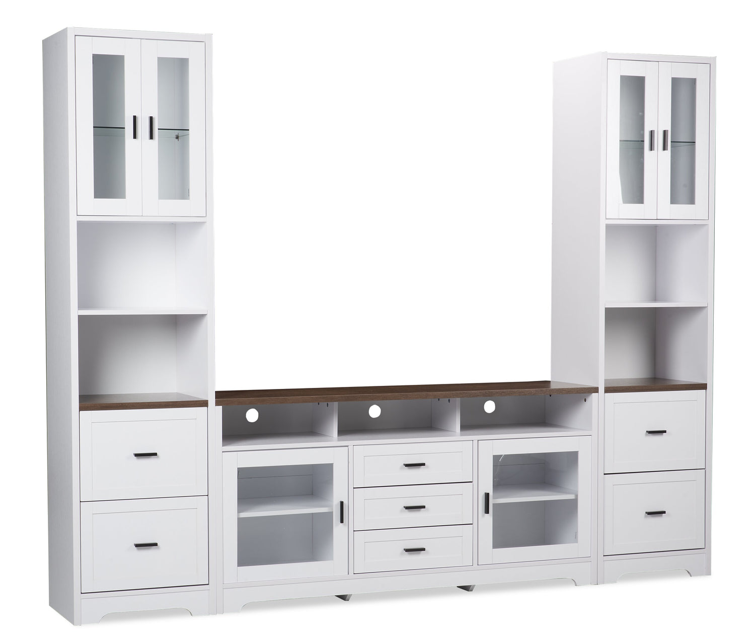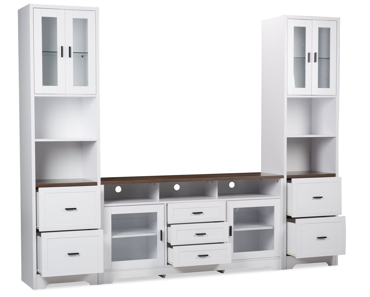| Options de rangement | Trois compartiments ouverts, deux armoires avec portes avant vitrées et tablettes réglables, trois tiroirs avec glissières en métal. |