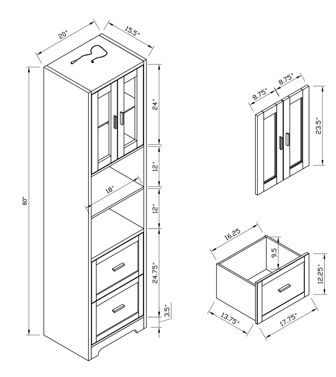 Largeur : 20 po (50,8 cm) Hauteur : 80 po (203,2 cm) Profondeur : 15,5 po (39,4 cm)