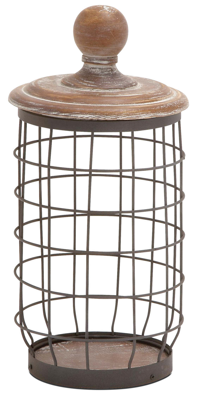 Ajoutez un éclat de style industriel à vos comptoirs ou à votre manteau de cheminée grâce à cette jarre décorative en grillage métallique et en bois. De taille idéale pour être utilisée dans la salle de bain comme support à papier hygiénique, cette charmante jarre à cage ouverte s'harmonise parfaitement avec le style champêtre douillet. Le couvercle sculpté sur un tour et la base en bois arborent un fini de couleur chêne naturel vieilli artificiellement afin que ce petit contenant donne l'impression d'avoir été chéri depuis de nombreuses années.