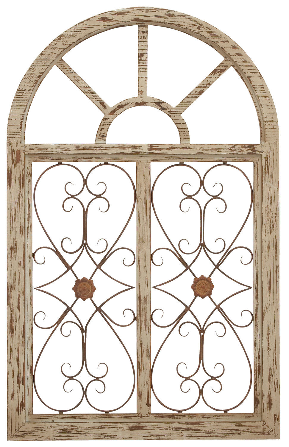 Ajoutez un caractère rétro et campagnard à vos murs grâce à ce panneau mural en bois et en métal. Doté d'un cadre vieilli et blanchi par les rayons du soleil avec des détails de style fer forgé, cet accessoire brille par son élégance champêtre décontractée. Le cadre simple de style fenêtre offre un magnifique contraste avec les incrustations et les médaillons en métal de motif complexe pour créer un mélange de matériaux et de formes qui plaisent vraiment à l'oeil.