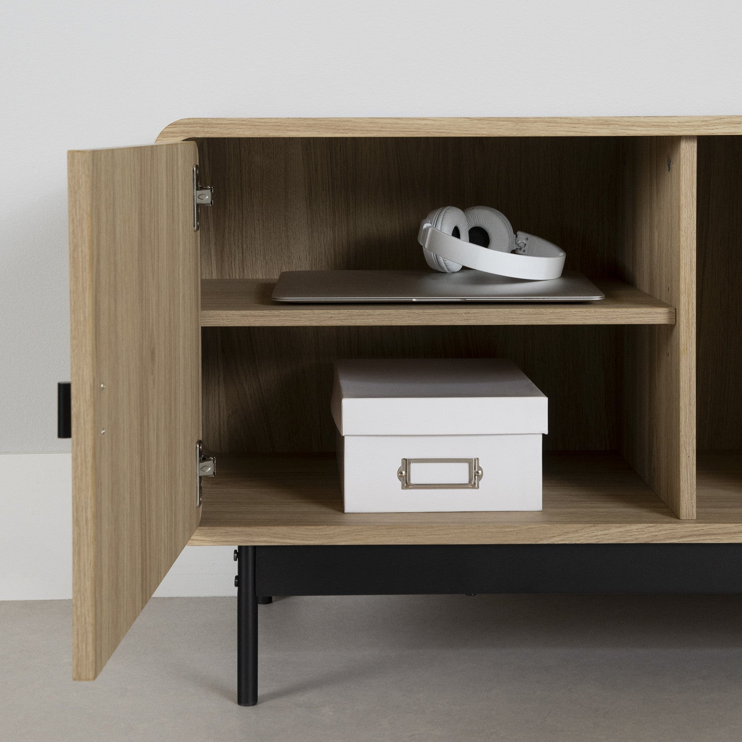 Doté de coins arrondis et de poignées minces en métal, ce meuble pour téléviseur Mezzy est une icône du style moderne qui transformera votre salle de séjour. Ses courbes douces et élégantes lui apportent une fluidité unique, ce qui fait du meuble Mezzy une pièce maîtresse qui attire l’attention dès le premier regard. Sa conception minimaliste et raffinée s’agence parfaitement à n’importe quel décor intérieur.