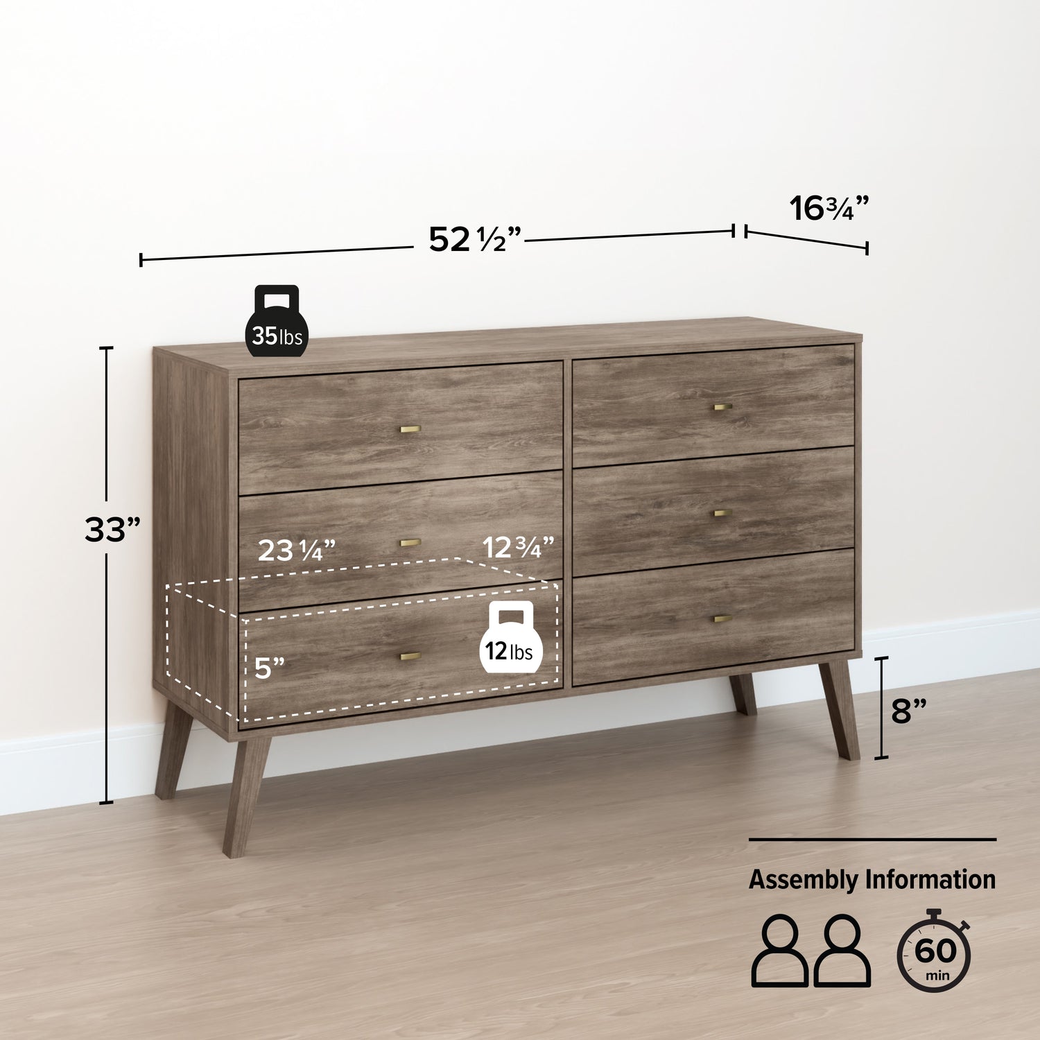 Largeur : 52,5 po (133,4 cm) Hauteur : 33 po (83,8 cm) Profondeur : 16 po (40,6 cm)