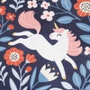 | Motif | Une licorne colorée et un motif floral sur un fond bleu marine. |