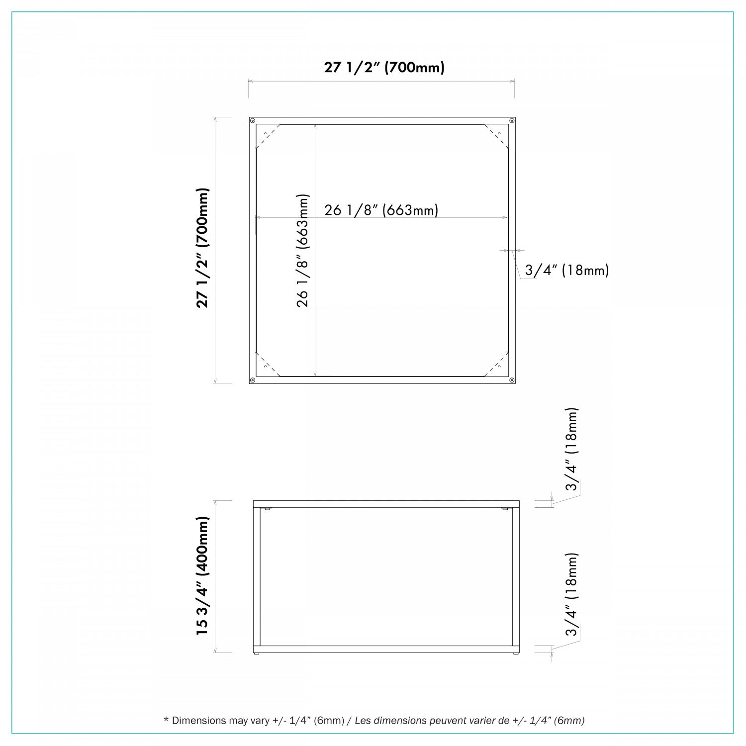 Largeur : 27,56 po (70,0 cm) Hauteur : 15,75 po (40,0 cm) Profondeur : 27,56 po (70,0 cm)