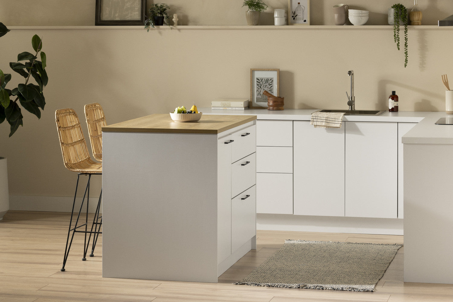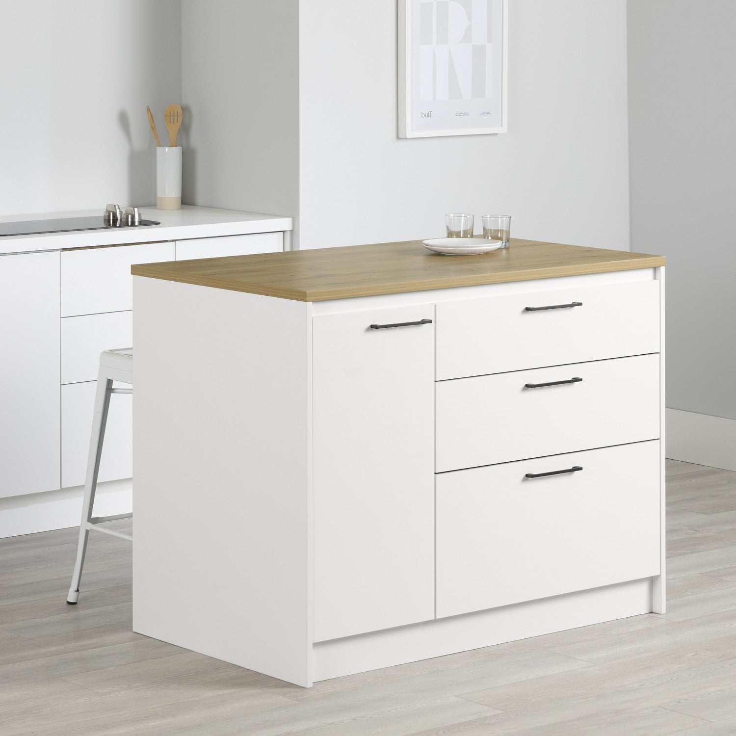 Myro Ilot De Cuisine Avec Porte Et Tiroirs - Blanc Et Erable Noix De Muscade