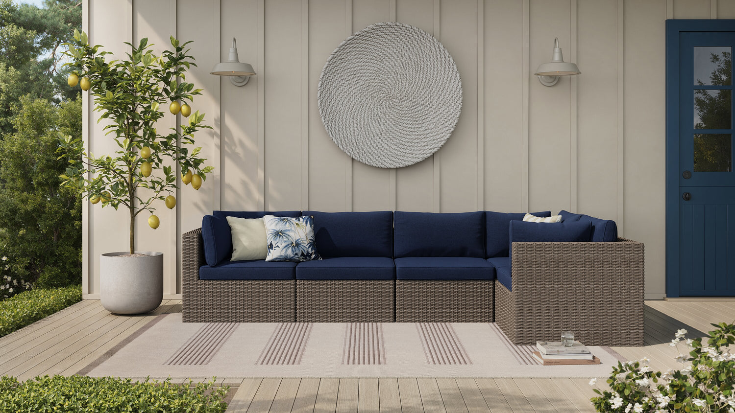 | Vendu séparément | Fauteuils avec accoudoirs, fauteuils en coin, pouf et table Naples pour la terrasse assortis. |