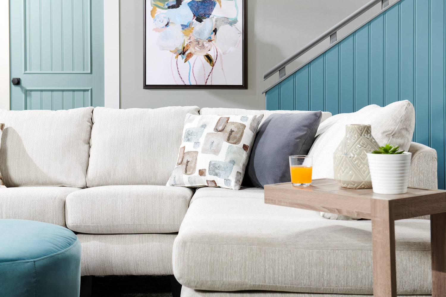 | Détails décoratifs | Un accoudoir courbé et des coussins de forme rebondie confèrent une apparence douillette et contemporaine à ce sofa sectionnel. |