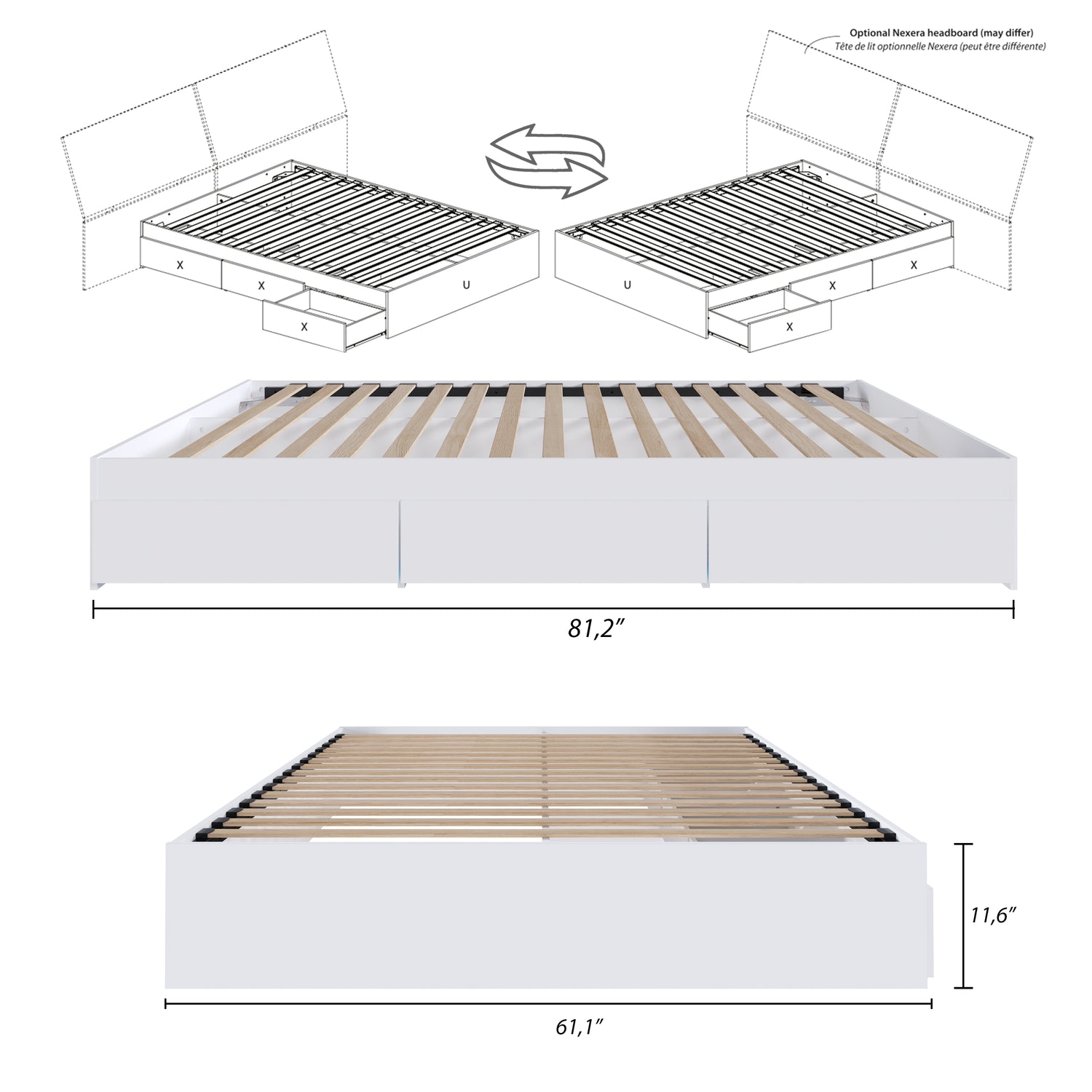 Largeur : 81,75 po (207,6 cm) Hauteur : 11,75 po (29,8 cm) Profondeur : 62 po (157,5 cm)
