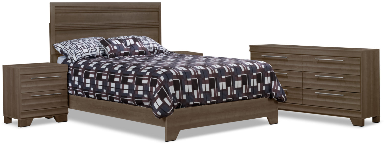 - Cet ensemble inclut un grand lit (tête de lit, pied de lit et traverses), une commode et deux tables de nuit.