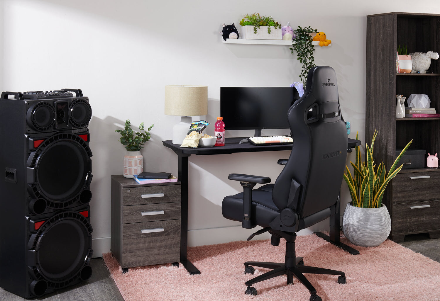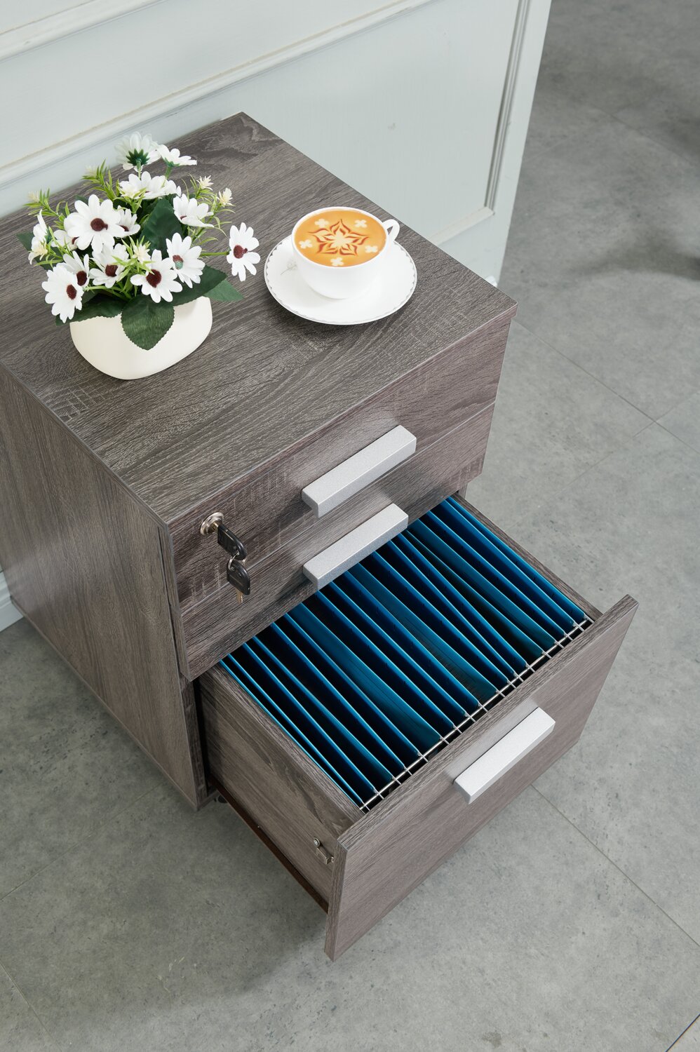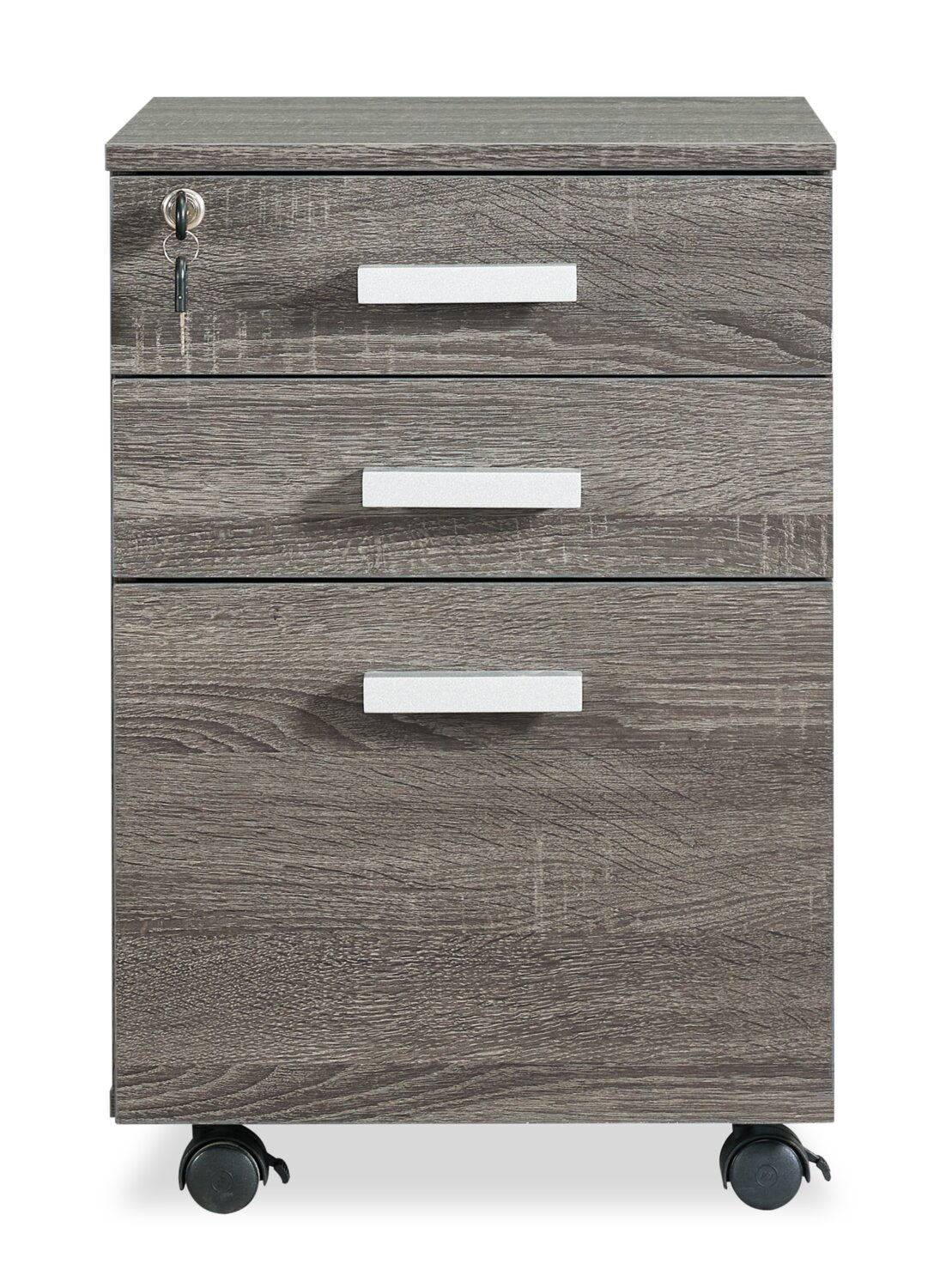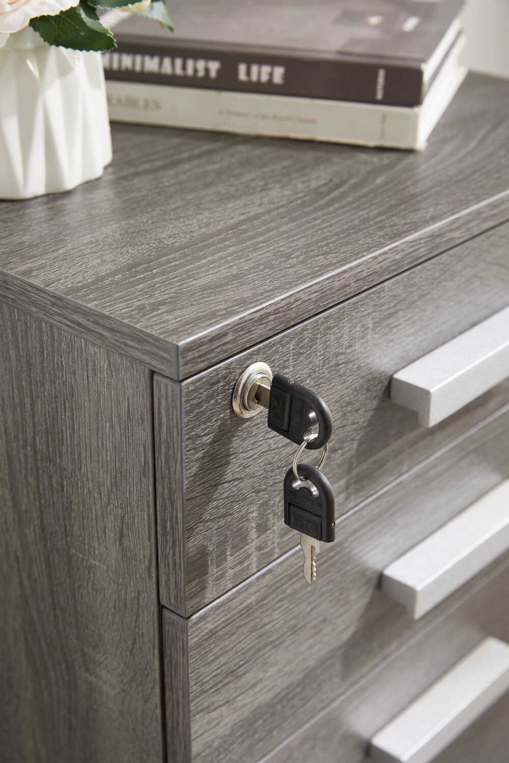 | Détails décoratifs | Les poignées de couleur argentée sur les tiroirs ajoutent une touche industrielle à ce meuble. |