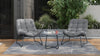 | Détails décoratifs | Le coussin capitonné gris clair s’agence bien au siège en rotin foncé, aux pattes en métal à armature ouverte et à la table en acier. |