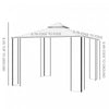 | Key Features | - Les supports decoratifs de l'armature sont de style orne; - Le tissu en polyester leger assure une sensation de fraicheur et de confort; - L'auvent est resistant a l'eau et comporte 8 trous de drainage pour eviter les dommages causes par les intemperies; - L'armature en acier a revetement par poudre resiste a la rouille tout en assurant la stabilite; - 8 piquets de terre sont inclus pour assurer la securite de votre gazebo; - L'assemblage est necessaire; - Note : Le gazebo n'est pas une structure permanente et n'est pas garanti contre les fortes pluies, la neige ou les vents |