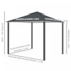 | Key Features | - Fabrique en metal anti-rouille et tissu polyester haute densite; - Conception a double toit pour la circulation de l'air; - Ideal pour utilisation dans le jardin, terrasse ou tout autre espace exterieur, parfait pour organiser les activites en plein air; - 4 cordages et 12 piquets d'encrage au sol inclus ajoutent une stabilite supplementaire; - Toile principale de toit perforee a 8 niveaux pour eviter toute formation de poche d'eau; - 4 panneaux lateraux avec cordons d'attache; - Assemblage requis |