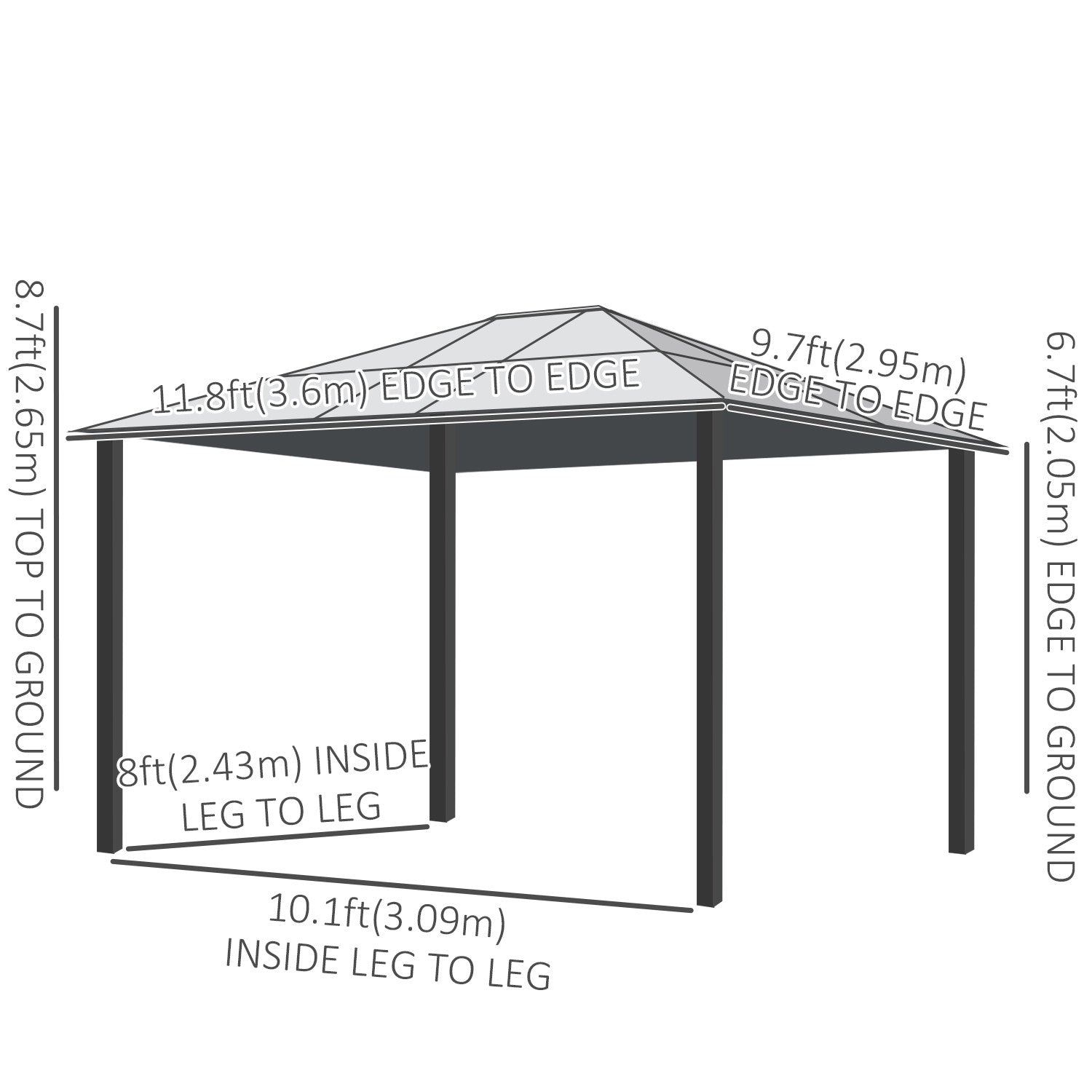 | Key Features | ● Le kiosque a toit rigide offre 107 pieds carres d'espace de vie exterieur ; ● Le cadre en aluminium robuste offre un excellent support au gazebo; ● Caracteristiques du toit en tole de polycarbonate epais resistant a l'eau et traite contre les rayons UV ; ● Les rideaux et les filets en filet gardent les insectes a l'exterieur et le confort a l'interieur; ● Comprend 8 ancrages qui maintiennent le gazebo stable au sol; ● Le toit ventile elegant dissipe la chaleur estivale et laisse passer la lumiere du soleil; ● Maille et rideau avec un design zippe pour une entree et une sortie faciles ; ● Grandes attaches Velcro sur chaque poteau en acier pour une fixation facile des rideaux; ● Assemblage requis avec tout le materiel necessaire inclus ; |