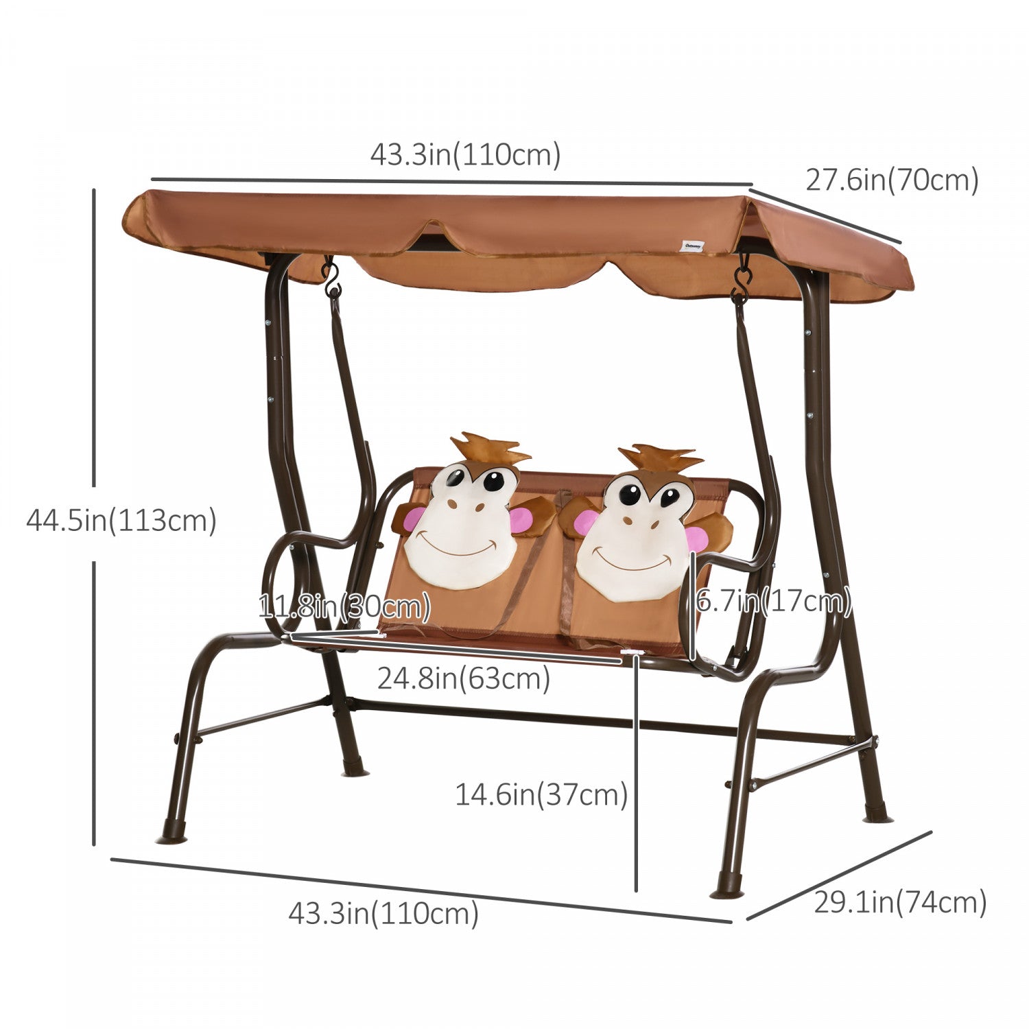 | Key Features | ● Le cadre metallique solide et les pieds antiderapants assurent la stabilite de la chaise ● La hauteur d'assise est concue pour les enfants, leur offrant ainsi beaucoup de confort ● Le motif de singe sur la surface rend le fauteuil balancoire double siege plein d'atmosphere estivale, ce qui fait que les enfants l'apprecient davantage ● L'auvent superieur reglable en angle protege vos enfants des coups de soleil ● La conception a double siege permet de rassembler leurs amis pour jouer ● 2 ceintures de securite assurent la securite de vos enfants ● Convient a tout endroit exterieur ou interieur et sera un excellent complement ● Assemblage requis |