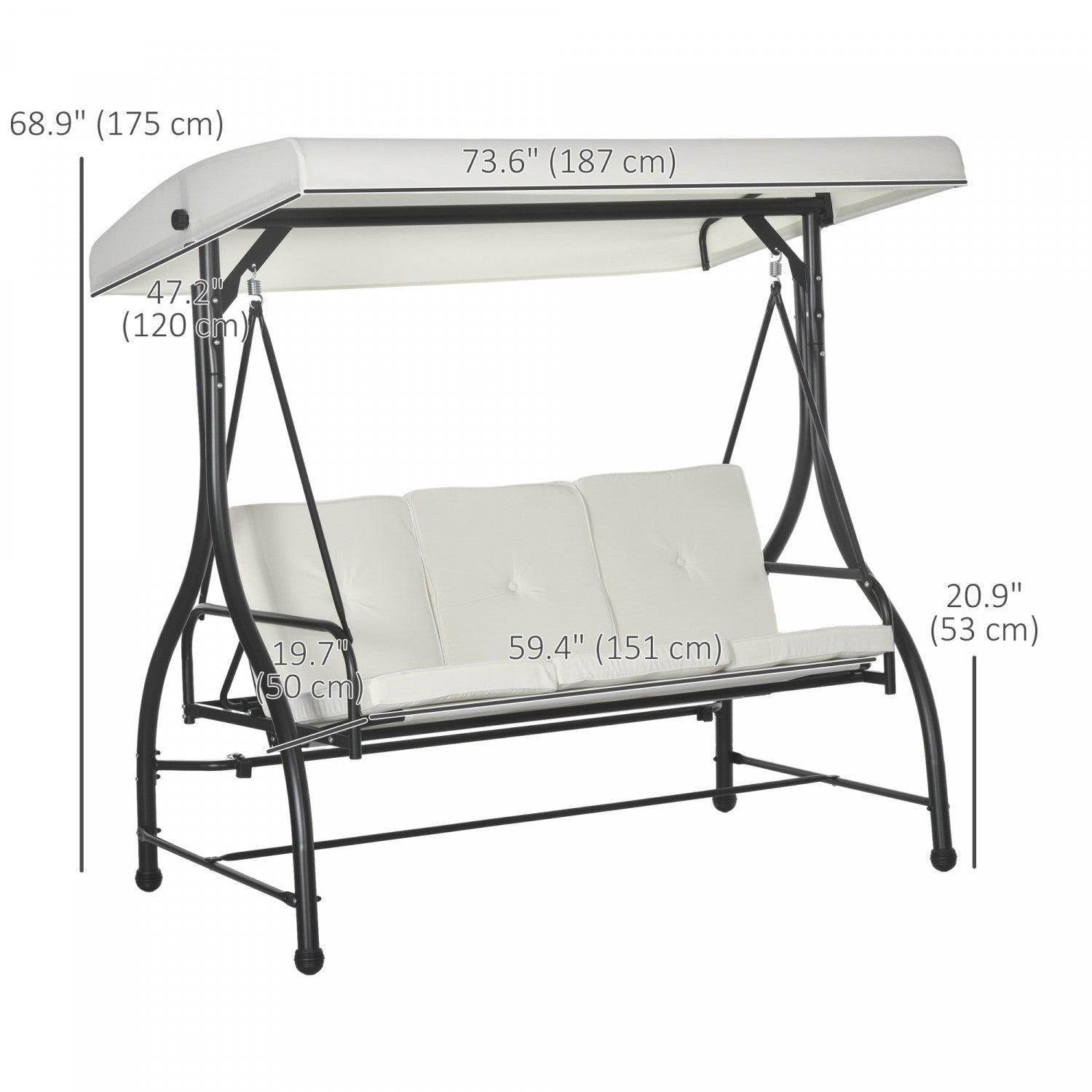 | Renseignements supplémentaires | - Couleur: Blanc creme et noir - Materiel: Acier, tissu de Polyester, maille respirante - Dimension globale 76.75"L x 46"I x 69"H - Taille du siege: 41,75 "l x 19,75 "P - Taille du coussin: 40.25"L x 19.75" I x 2.75"H - Taille de la canopee: 74.5"L x 46.25"I - Taille du lit :57"L x 41"I - Hauteur assise au sol: 18" H - Capacite de poids: 528lbs - Poids Net: 81lbs - Ref.: 84A-031V01CW |