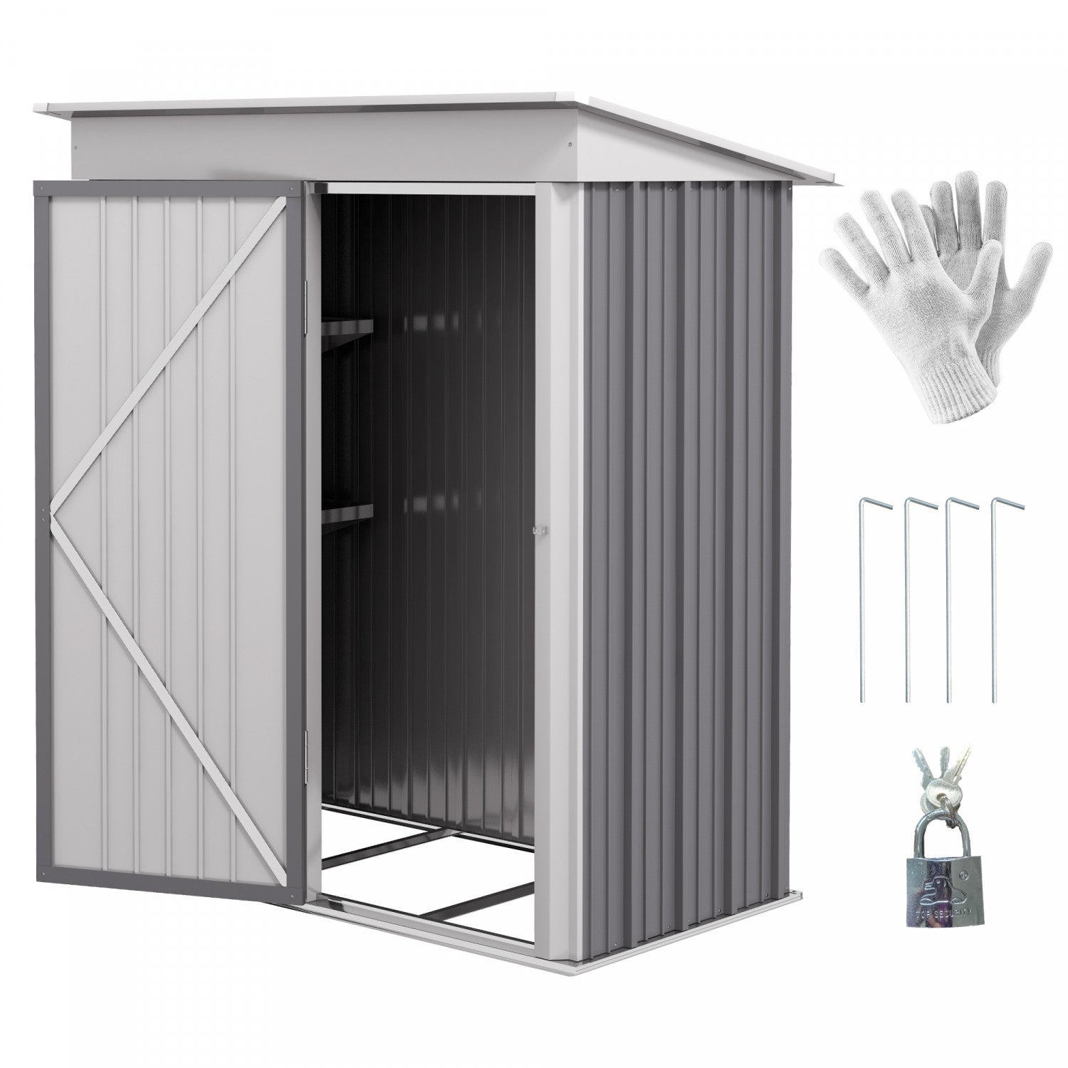 | Key Features | - Hangar de rangement spacieux pour les outils de jardin, le materiel d'entretien de la pelouse ou les fournitures de piscine - Construit en acier galvanise pour resister aux intemperies - Toit en pente pour eviter l'accumulation d'eau - Porte verrouillable pour plus de securite - Deux fentes d'aeration pour garder l'interieur sec et frais - Veuillez noter qu'une fondation de sol est incluse - Assemblage requis Remarque : veuillez lire attentivement les instructions ou la video de montage avant l'installation pour reduire le temps d'installation |