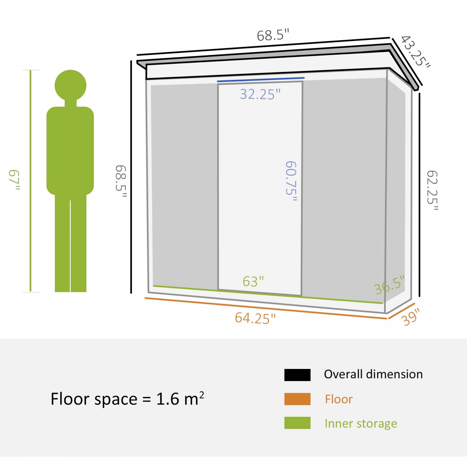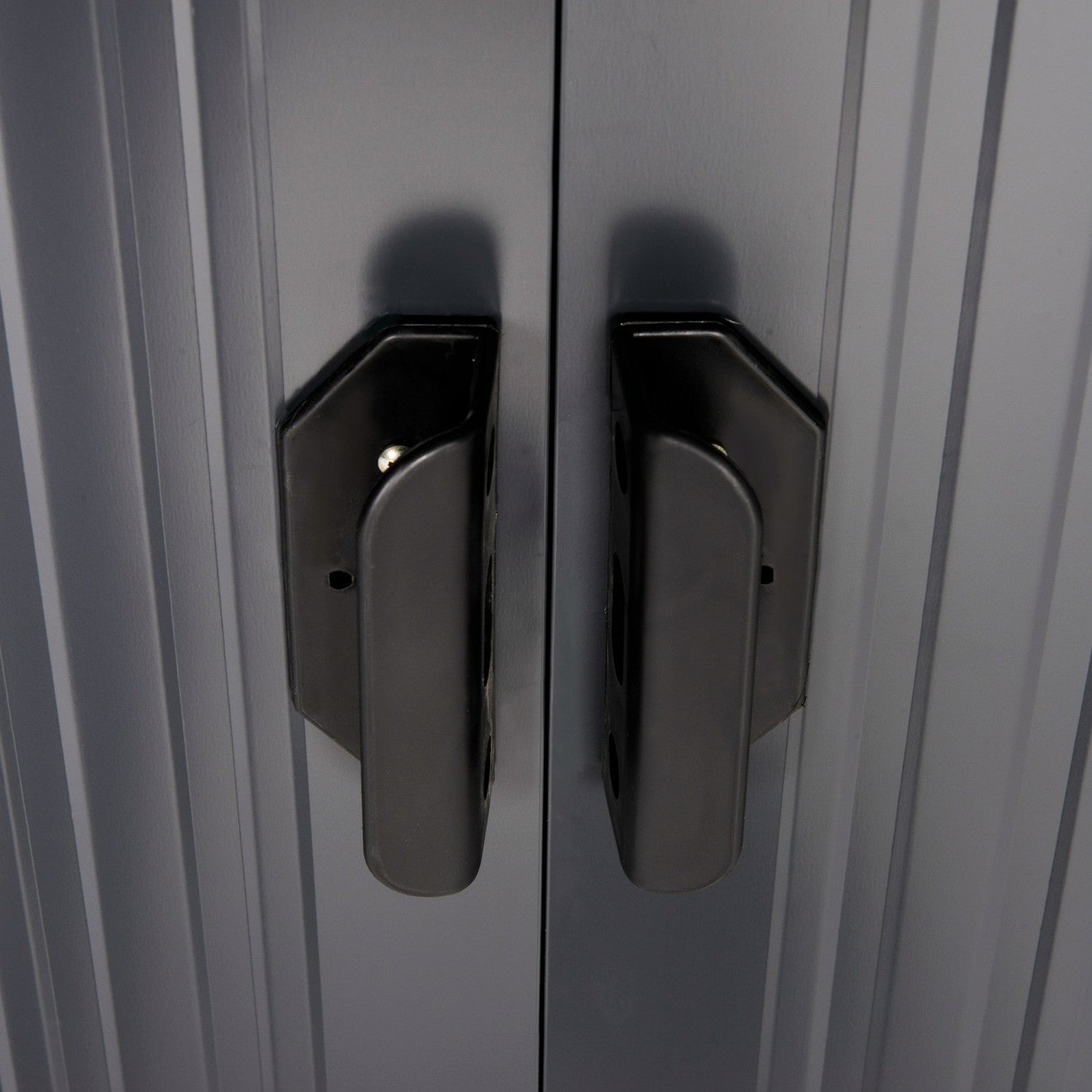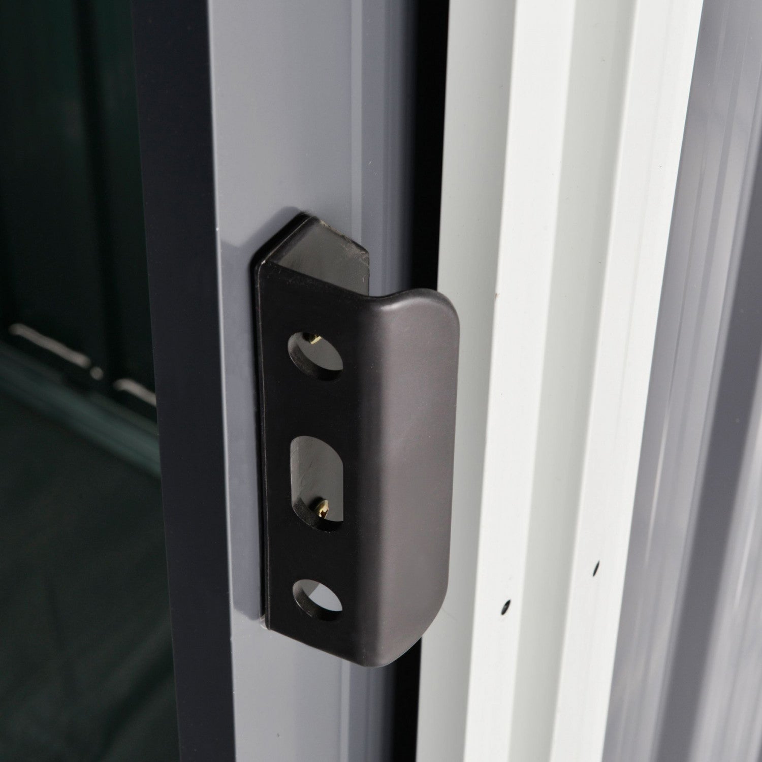 | Key Features | ● Beaucoup d'espace de rangement ● Murs et toit en panneaux d'acier resistants a la rouille et a la pluie ● Le toit en pente empeche l'accumulation d'eau ● Double porte coulissante pour un acces facile a l'interieur et a l'exterieur ● La porte est verrouillable pour plus de securite ● Deux fentes d'aeration maintiennent l'interieur frais et aere ● Assemblage requis |