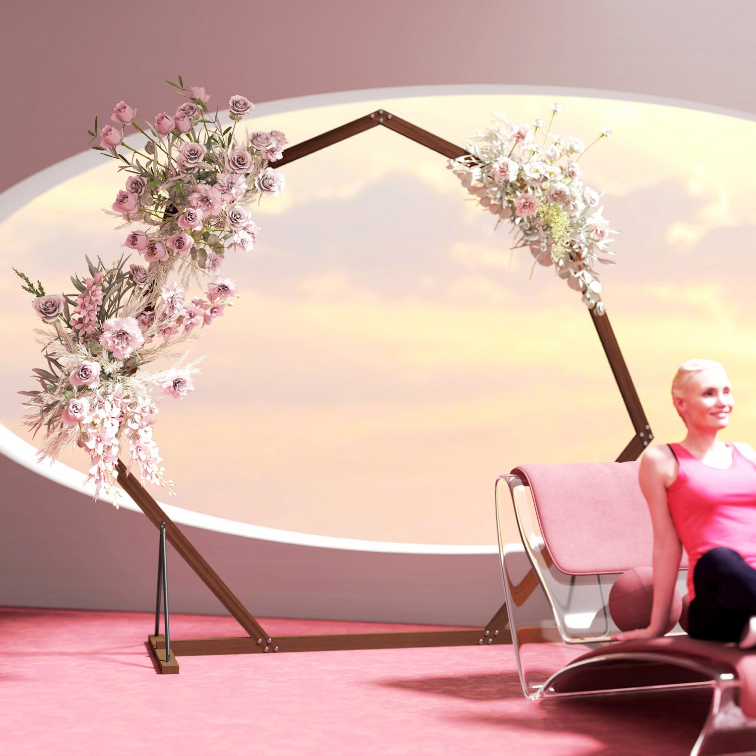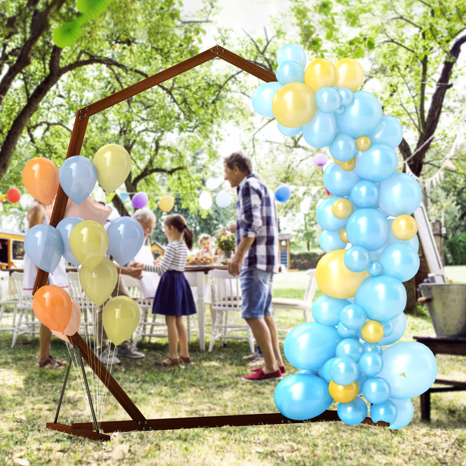 | Key Features | - La forme heptagonale unique ameliore l'attrait esthetique ; - La construction en bois de sapin naturel offre une durabilite accrue ; - Le polissage et la peinture assurent la resistance aux intemperies ; - Les bases triangulaires et les joints securises offrent la stabilite ; - La base fixable au sol ameliore la securite et la robustesse ; - Adaptable pour la decoration avec des fleurs, des lumieres ou des ballons ; - Assemblage requis ; |