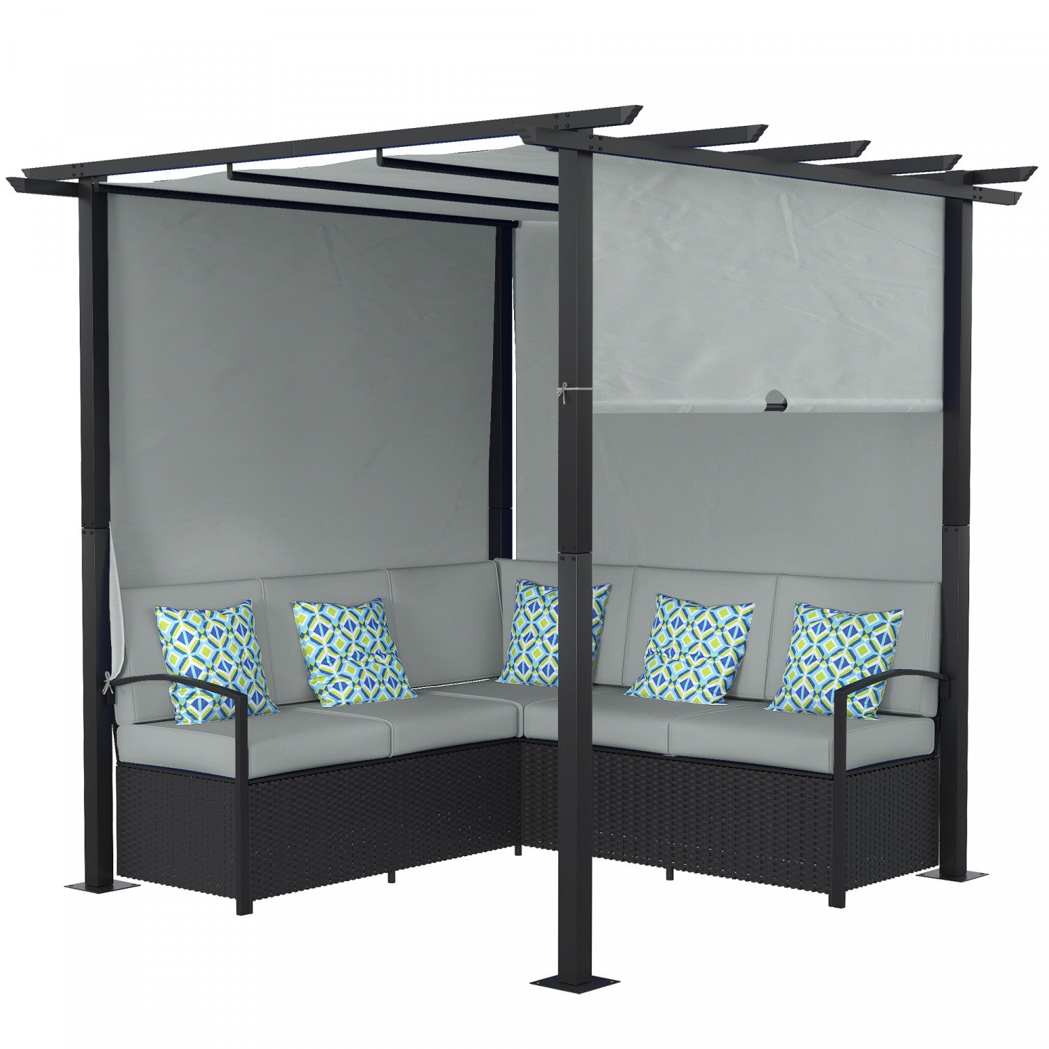 | Renseignements supplémentaires | - Couleur : cadre noir, tissu gris, oreiller blanc et vert ; - Materiau : acier, rotin PE, polyester ; - Dimension globale : 90,6" L x 90,6" l x 82,7" H (230 x 230 x 210 cm) ; - Dimension trois places : 67,7" l x 22,4" P x 12,6" H (172 x 57 x 32 cm) ; - Dimension du canape double : 45,3" l x 22,4" P x 12,6" H (115 x 57 x 32 cm) ; - Hauteur de la pergola : 82,7" (210 cm) ; - Capacite de poids : 792 lb (360 kg) (trois places), 528 lb (240 kg) (canape double) ; - Etiquette de l'article : 860-261V00GY ; |