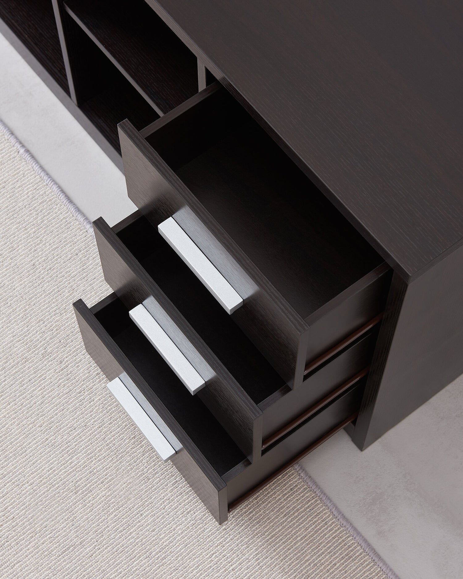 | Détails décoratifs | Les poignées de couleur argentée sur les tiroirs s'assortissent aux pattes pour conférer une touche industrielle à ce meuble. |