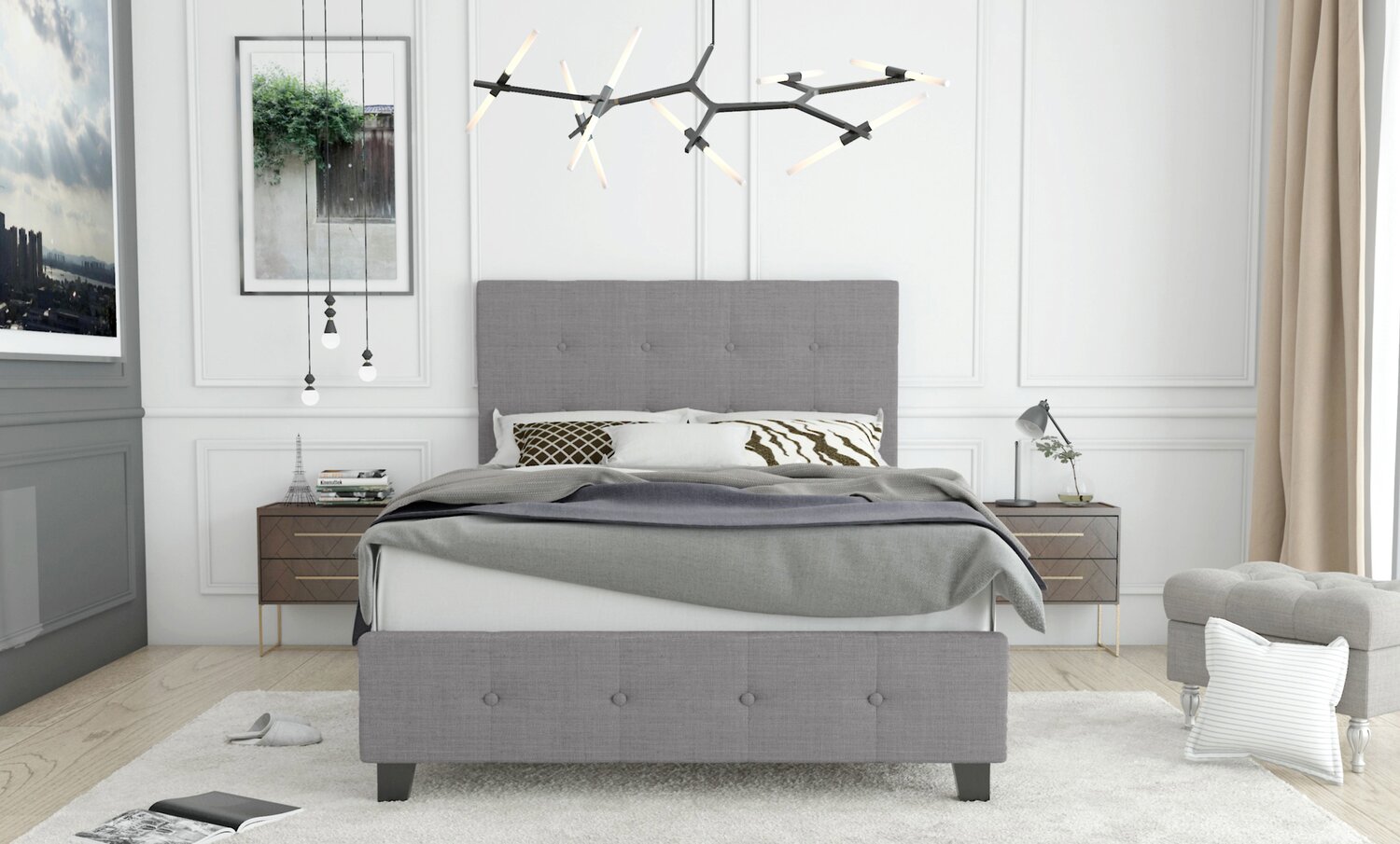 | Détails décoratifs | Le capitonnage à boutons sur la tête et le pied de lit rehausse le rembourrage en mousse sous le tissu d’apparence lin. |