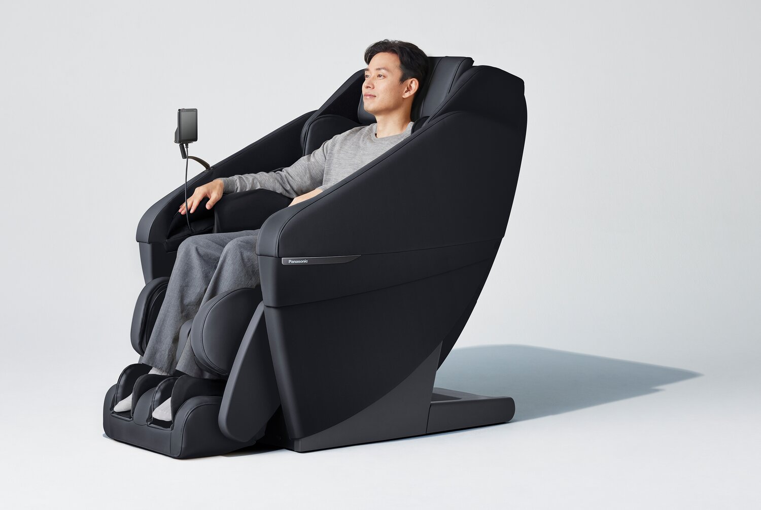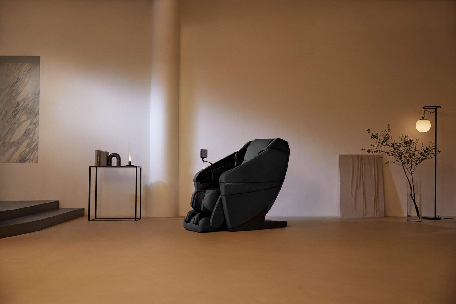 | Pieds du meuble | La base en plastique noir fournit un soutien robuste tout en contenant le boîtier d’alimentation de ce fauteuil de massage. |