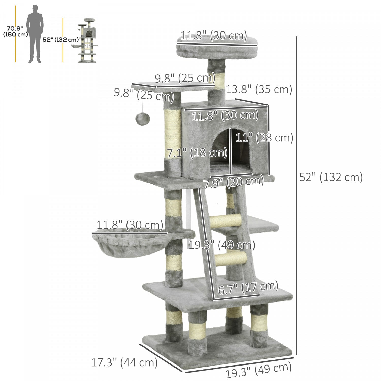 | Key Features | ● Conception multi- activites de perchoirs, d'un hamac, d'un lit et d'une grande maison pour les divertir ; ● Cadre en panneaux de particules pour plus de resistance et de durabilite, avec une base inferieure pour le maintenir droit et stable ; ● Les griffoirs en sisal permettent a votre chat d'aiguiser ses griffes en toute securite ; ● Revetement en peluche doux et confortable pour plus de securite ; ● Le condo pour chat convient aux chats de moins de 5 kg, assemblage requis ; |