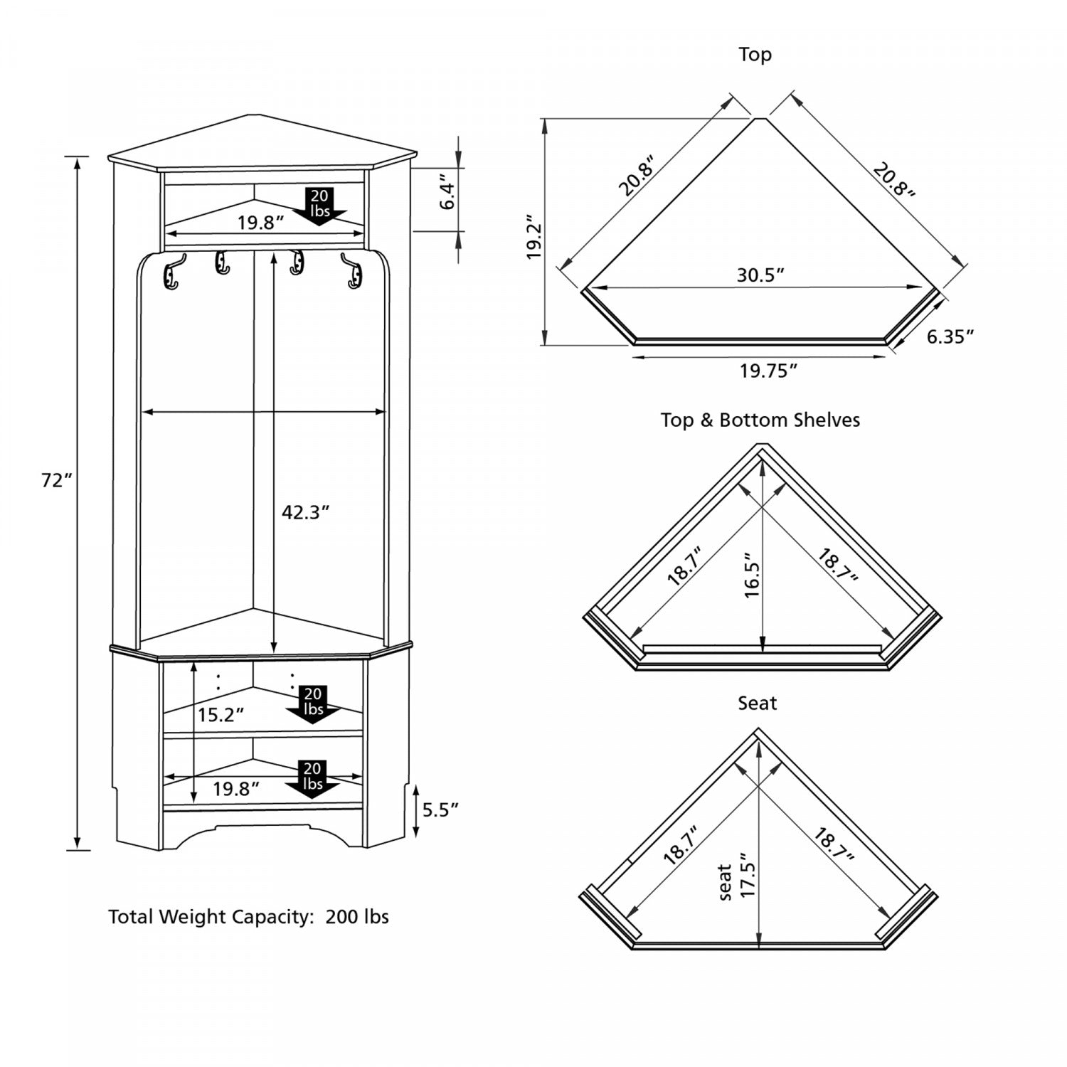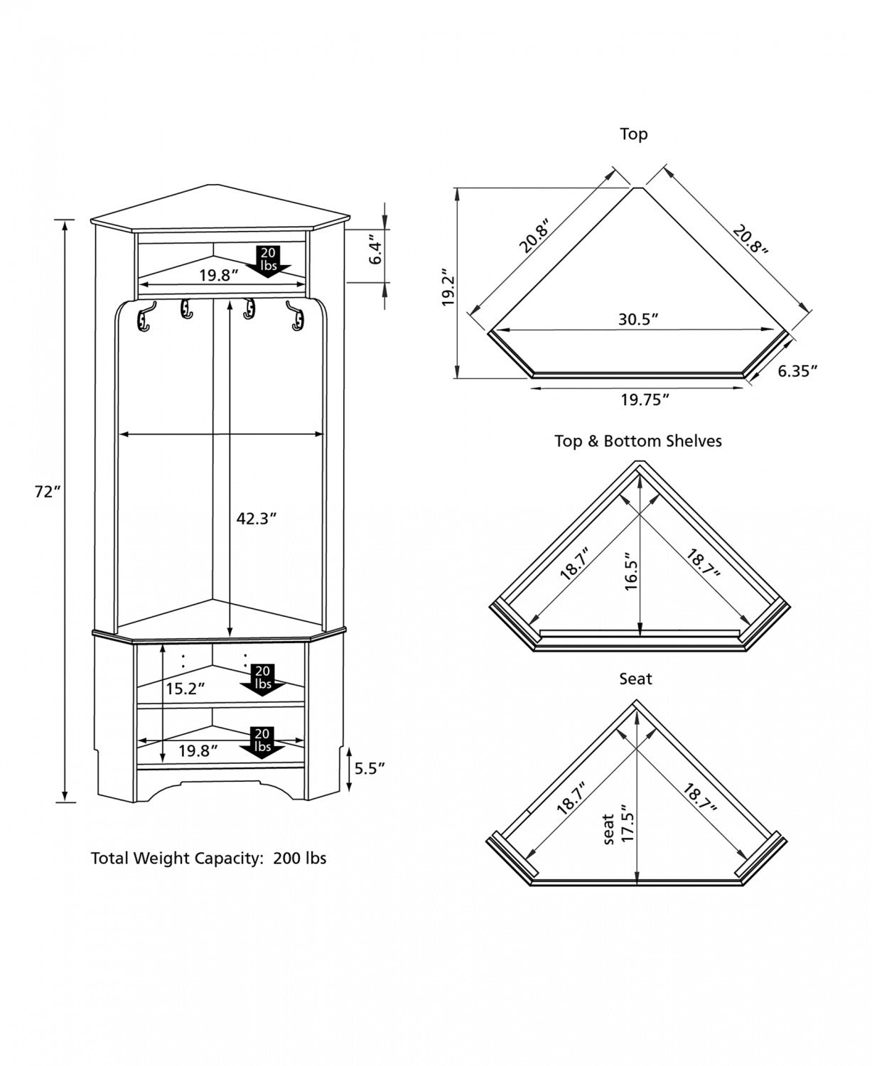 Largeur : 30,5 po (77,5 cm) Hauteur : 72 po (182,9 cm) Profondeur : 19,25 po (48,9 cm)