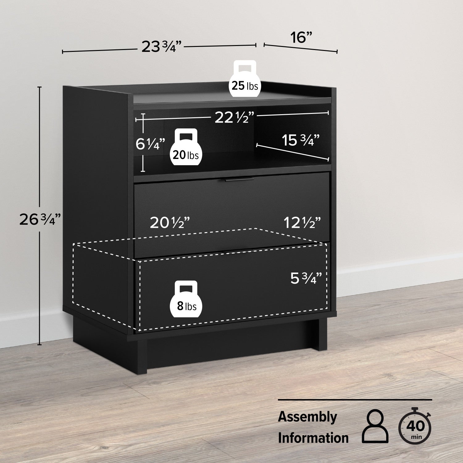 Largeur : 23,75 po (60,3 cm) Hauteur : 26,75 po (67,9 cm) Profondeur : 16 po (40,6 cm)