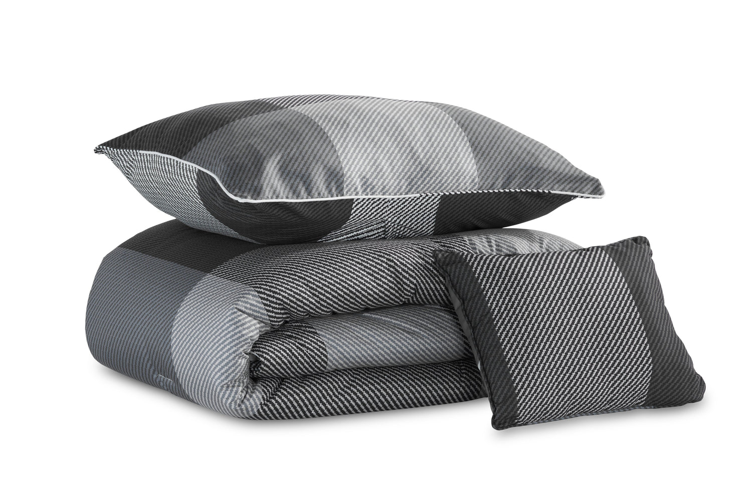 | Détails décoratifs | Le coussin gris possède un appliqué blanc en zigzag. |